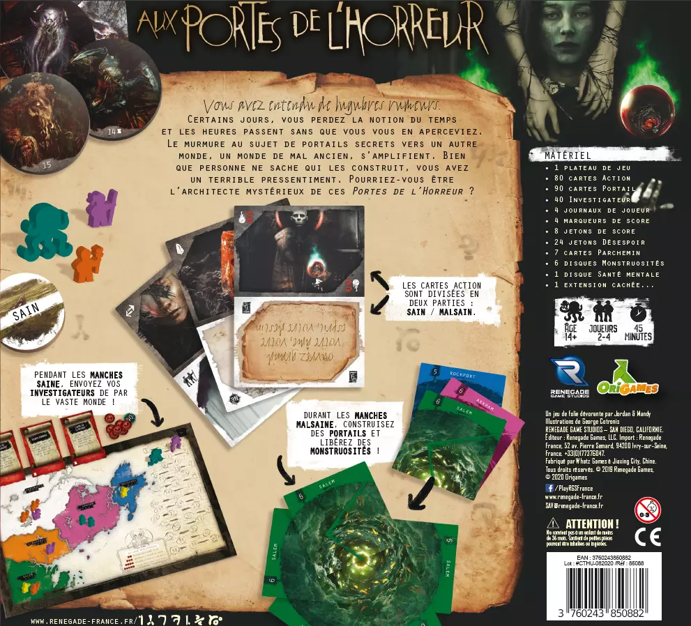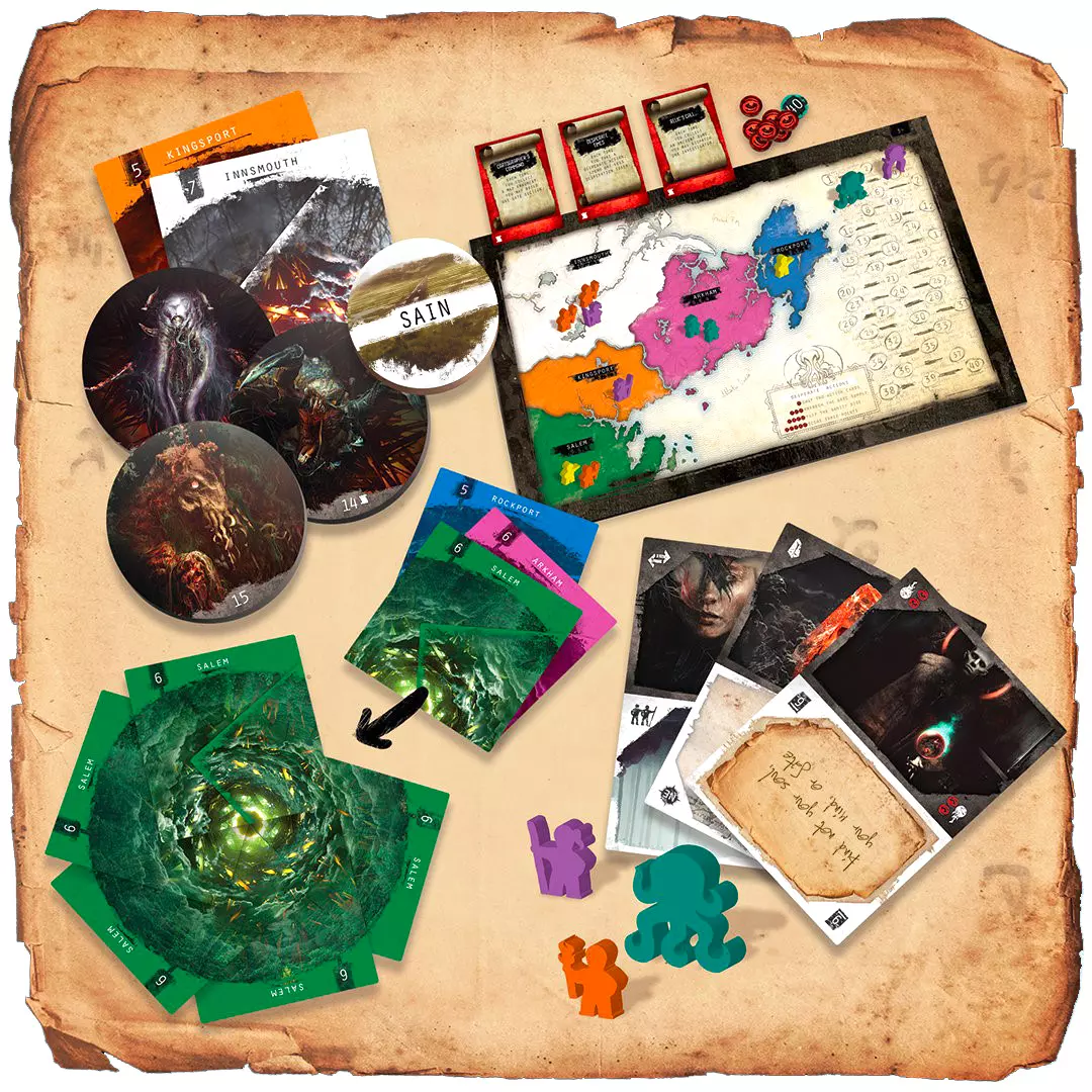 Choisissez quel sera le statut du tour : sain ou malsain. Les joueurs doivent alors jouer leur cartes selon votre choix. Envoyez vos investigateurs de Salem à Arkham. Ouvrez des portails et libérez des monstruosités. Soyez majoritaire dans les régions où les portails s'ouvrent pour marquer un maximum de points. Faites des actions désespérées pour augmenter vos effets. Plus vous collectionnez de fragments de plans, de runes et de parchemins, plus vous scorez de points. Allez-y, vous n'en reviendrez pas...
