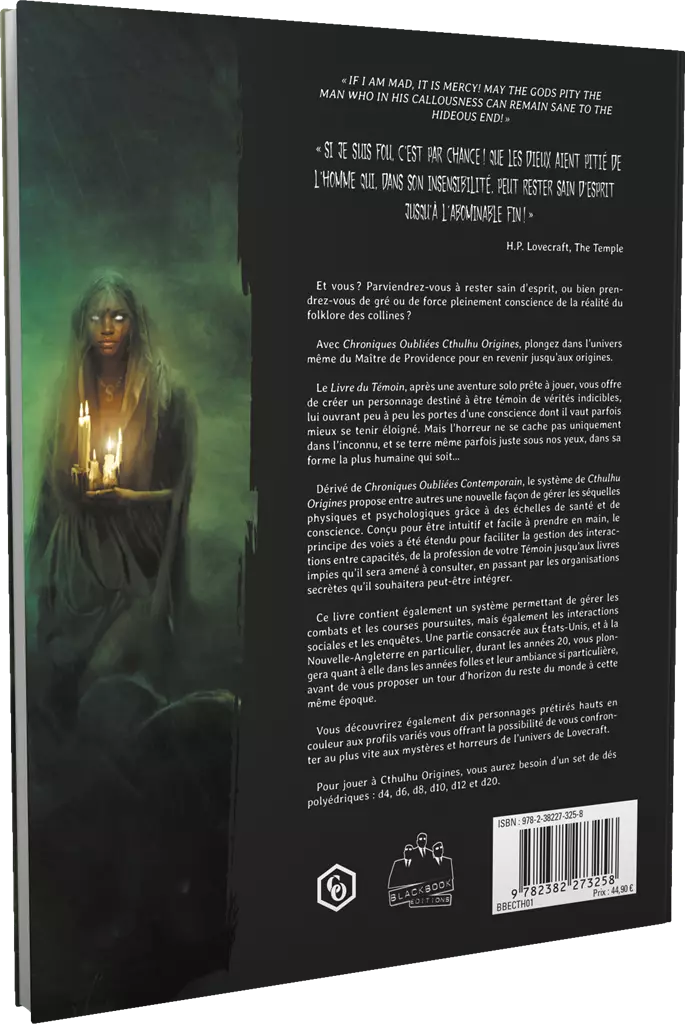 Le Livre du Témoin, après une aventure solo prête à jouer, vous offre de créer un personnage destiné à être témoin de vérités indicibles, lui ouvrant peu à peu les portes d’une conscience dont il vaut parfois mieux se tenir éloigné. Mais l’horreur ne se cache pas uniquement dans l’inconnu, et se terre même parfois juste sous nos yeux, dans sa forme la plus humaine qui soit…