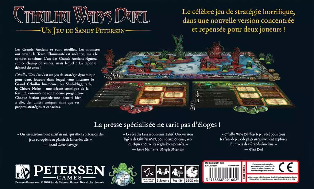 Les Grand Anciens se sont éveillés. Les monstres ont envahi la Terre. L'humanité est anéantie, mais le combat continue?! Un seul des Grands Anciens régnera sur ce champ de ruines, mais lequel ? C'est aux joueurs d'en décider. Retrouvez toute la thématique du «monster game» Cthulhu Wars, signé Sandy Petersen, le père du jeu de rôles L'Appel de Cthuthu, dans une version spécialement conçue pour deux. Cthulhu Wars Duel permet à 2 joueurs de vivre le réveil des Grands Anciens et de contempler la fin du monde. Chaque joueur incarne un Grand Ancien (Cthulhu ou Shub-Niggurath), les horreurs cosmiques qui lui sont associées et les manifestations de son culte. Vous vous livrerez à lutte sans merci pour annihiler votre adversaire, un autre Grand Ancien. Ce jeu est une variante du jeu de stratégie multi joueur Cthulhu Wars, mais il est suffisamment différent pour satisfaire ceux qui ont déjà joué à sa version classique. Certaines des factions citées dans le livret de règles (souvent dans les exemples) ne figurent pas dans cette boîte. Cette boîte est en effet la première de la gamme. Les prochaines vous proposeront à chaque fois deux nouvelles factions et un nouveau champ de bataille pour vos affrontements. Toutes les boîtes de cette gamme seront compatibles?!