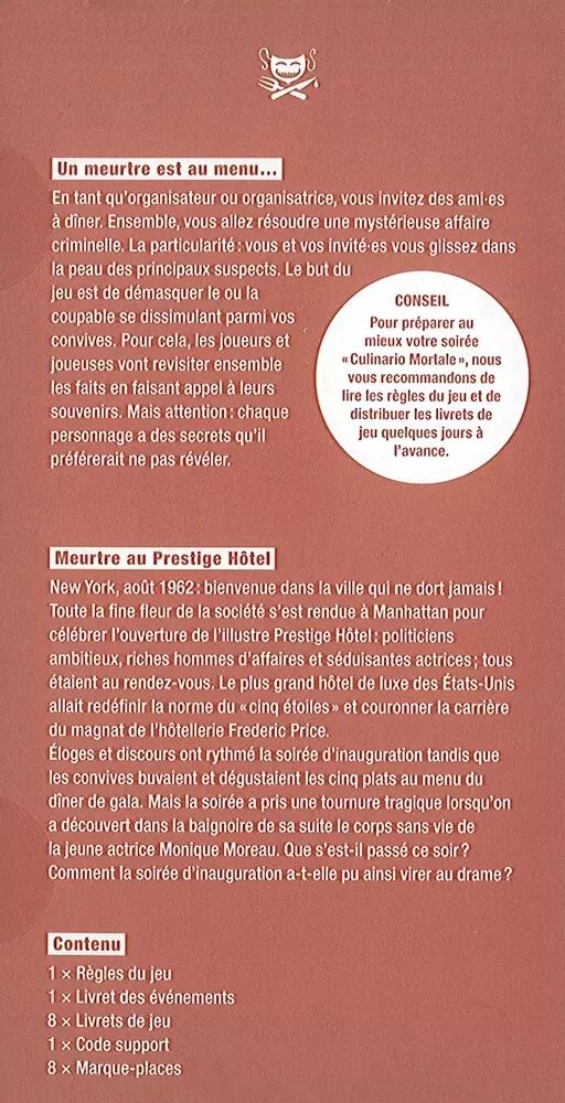 Le temps d'un repas, les joueurs incarneront chacun un personnage. Un drame vient d'avoir lieu, les joueurs devront mener l'enquête pour trouver le coupable qui se trouve parmi eux. Le rythme est soutenu et l'intrigue est palpitante, pour une soirée pleine de rebondissements ! Culiniario Mortale est un jeu d'enquête qui se déroule autour d'une table. Les joueurs incarnent des personnages qui sont les témoins et suspects d'un crime. Parmi eux se trouve le coupable. Les joueurs doivent démasquer le coupable et le coupable doit passer inaperçu. On remet à tous les joueurs un livret qui indique qui ils sont et ce qu'ils ont fait avant le crime.Tous les personnes vont se remémorer ce qu'il s'est passé avant le drame. Le jeu se déroule en trois tours qui correspond à trois périodes avant le meurtre. Les joueurs vont échanger ensemble sur ce qu'ils ont vu et fais. Pour cela ils se référent au livret qui donne la chronologie des faits. Attention, personne ne peut mentir, sauf le meurtrier. A l'issue des trois tours, un vote a lieu pour désigner le coupable.