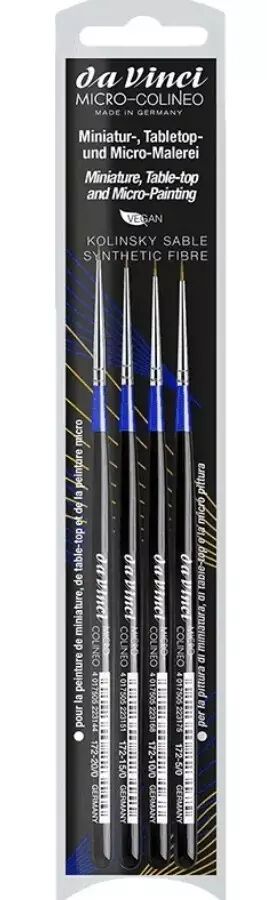 La gamme spéciale avec les plus petites tailles pour les détails les plus fins Nous sommes ravis d‘avoir réussi à créer cette nouvelle gamme de pinceaux pour tous les types de figurines, de « table top » et de micro-peinture avec nos fibres synthétiques COLINEO imitation de la martre rouge très appréciées. Une composition spéciale de différentes longueurs de fibres synthétiques droites et ondulées avec des pointes extra fines, pointe fine, grande élasticité et bonne absorption de la peinture. Manche esagonal court spécialement conçu - avec bande bleue - qui tient parfaitement dans la main et ne roule pas.