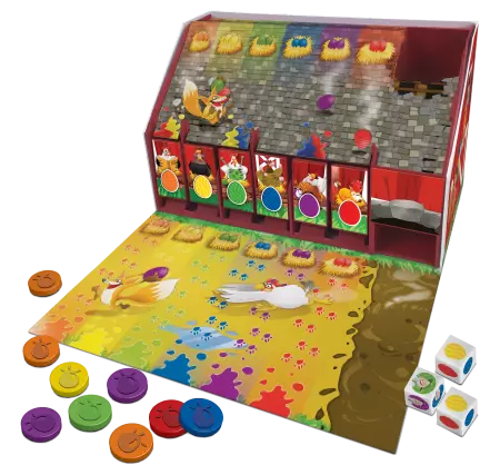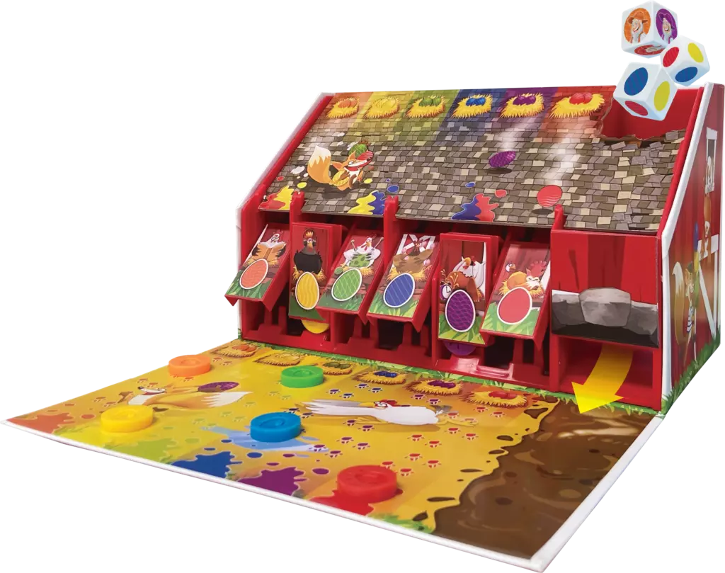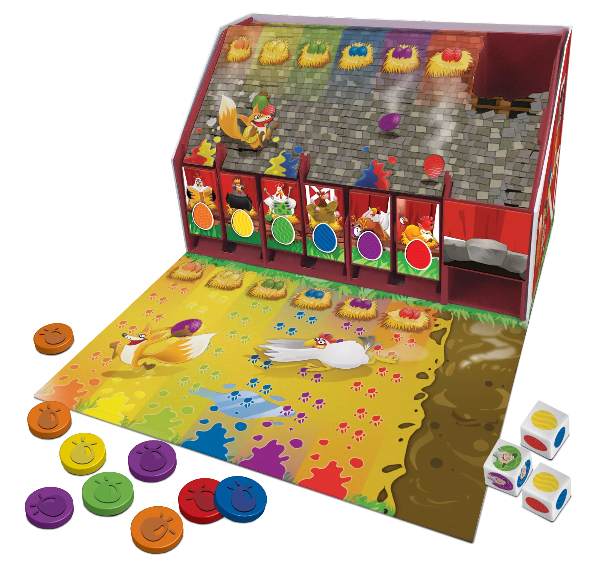 Lancez les dés dans le poulailler ! Ils indiquent quels oeufs vous pouvez choisir et lequel est interdit (car le fermier veille).