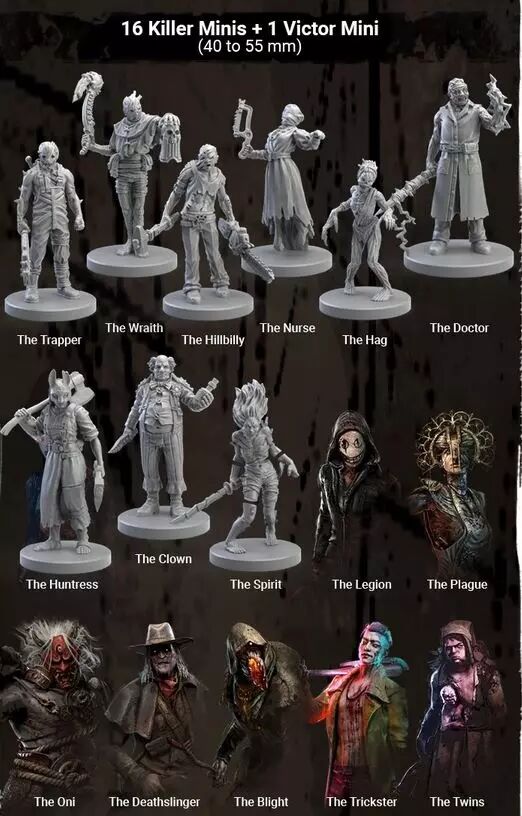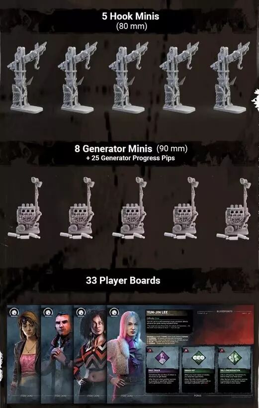 Dead by Daylight, adaptation du jeu vidéo éponyme assez célèbre dans laquelle un tueur de Serie B poursuit plusieurs survivants qui essayent de réparer les générateurs de la porte de sortie afin de s’échapper. Le jeu se joue de 3 à 5 joueurs, en un-contre-tous (mais toujours avec quatre survivants) avec des mouvements cachés.