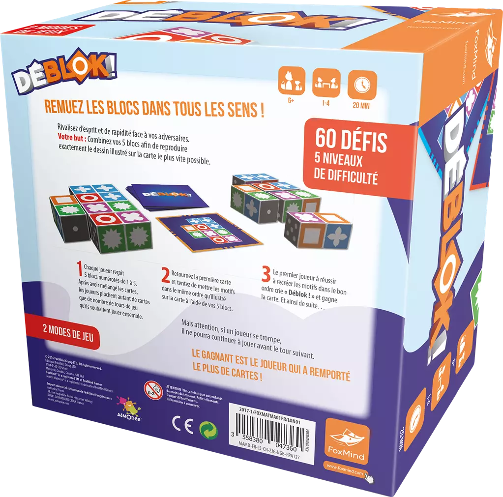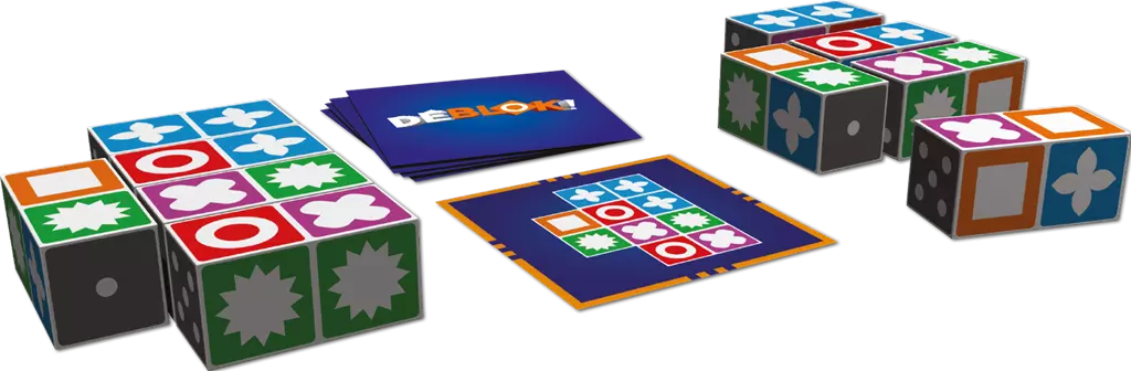 Déblok est un jeu de société addictif qui met vos réflexes et votre sens de l'observation à l'épreuve. Chaque joueur dispose de 5 blocs colorés avec des symboles différents. Le but du jeu est de reproduire le plus rapidement possible le schéma illustré sur une carte en retournant ses blocs. Le premier joueur à y parvenir crie "Déblok !" et remporte la carte.