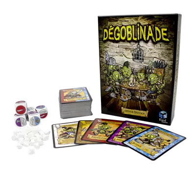 Dans Dégoblinade, vous allez devoir jouer des cartes pour infliger des dégats à vos adversaires ou pour gagner en réputation. Vous ne pouvez jouer que des cartes de la couleur correspondant à la face de votre dés, pour attaquer, vous défendre, et surtout faire un tas de coups bas à vos comparses, qui l'ont bien mérité ! Si vous êtes le seul à qui il reste des dents, vous remportez la grande Dégoblinade !