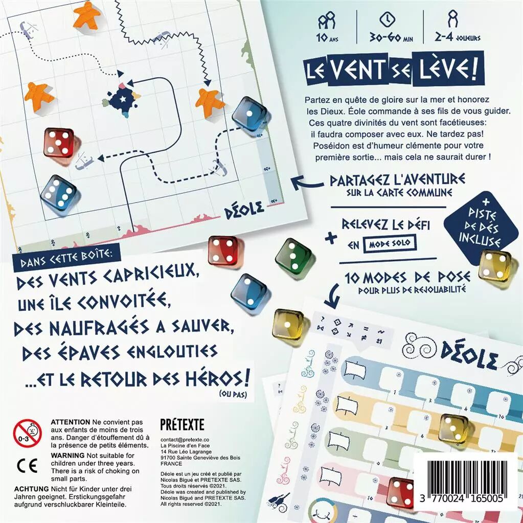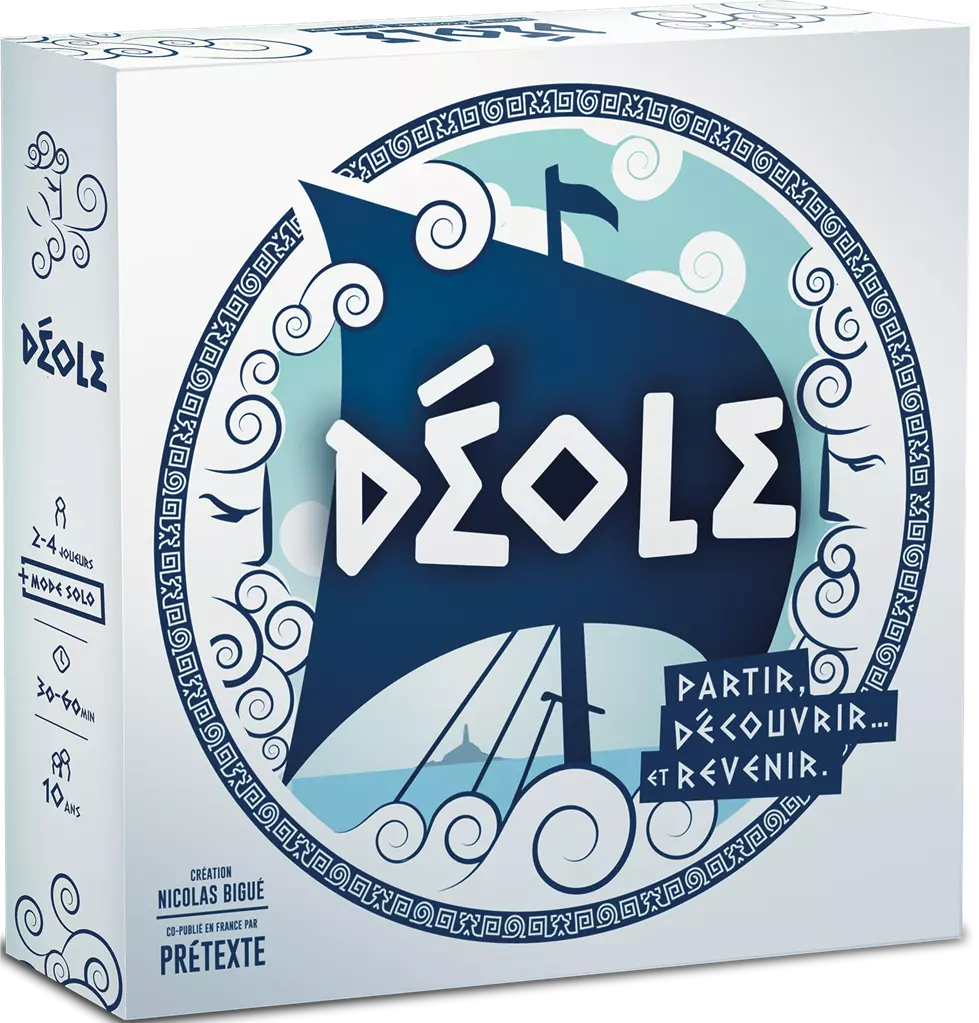 Déole est indéfiniment rejouable, grâce à de multiples principes de combinaisons de dés, des scénarios et des dilemmes ajustables, du niveau marin au niveau capitaine. Il y a 10 règles différentes de pose de dés, vous en utilisez 5 par partie, ce qui vous permettra effectivement de varier les plaisirs. Explorez au plus loin au gré des vents, portez secours aux naufragés que vous croiserez, fouillez les épaves englouties et débarquez le premier sur l'île d'Éolia pour être récompensé. Durant votre périple, vous pourrez compter sur votre équipage pour vous sortir d'un mauvais pas, mais n'oubliez pas de rentrer à temps pour raconter vos exploits... Celui ou celle capable de composer avec tous ces éléments sera vainqueur et apportera la protection des Dieux sur sa cité. Une règle pour jouer en solo est également fournie.