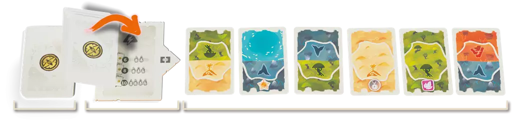 La rivière de six cartes disponibles fonctionne comme un marché imprévisible. Vous avez accès à deux cartes adjacentes, pas plus, ce qui force des choix : attendre une meilleure combo ou prendre ce qu'il y a maintenant ? Progressivement la rivière se transforme et les opportunités changent. Certaines cartes sont combinées, d'autres isolées. Cette limitation crée une vraie tension sans ajouter de complexité : vous ne pouvez jamais avoir exactement ce dont vous rêviez.