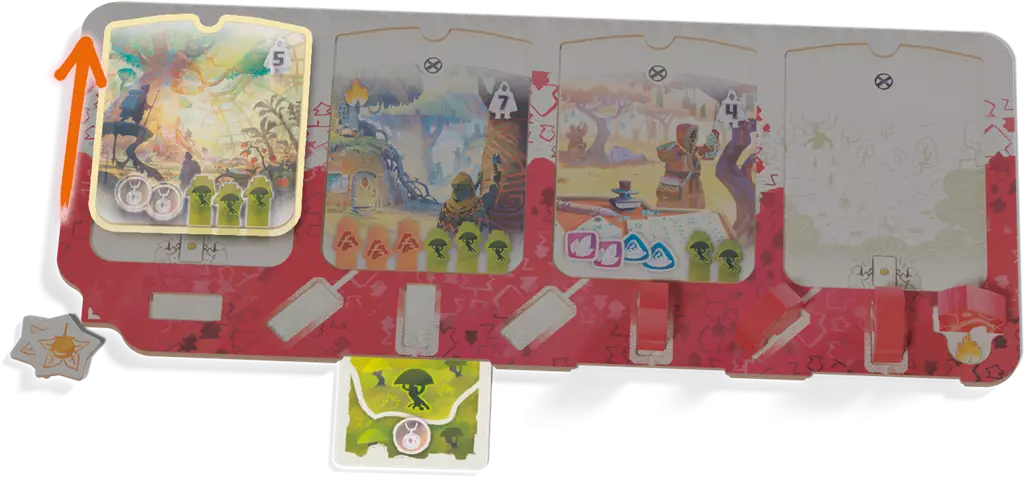 Collecter des baies, maîtriser le feu (les symboles flamme), obtenir des jetons fleurs : chaque ressource apporte des points bonus ou des effets spéciaux. La majorité en feu rapporte un gros bonus, ce qui crée une course à la majorité souterraine. Vous pouvez même glisser des cartes sous votre plateau pour débloquer des terrains gratuitement ou ajouter des ressources permanentes à votre tableau. C'est de l'optimisation pure sans aucun hasard après le tirage de la rivière.