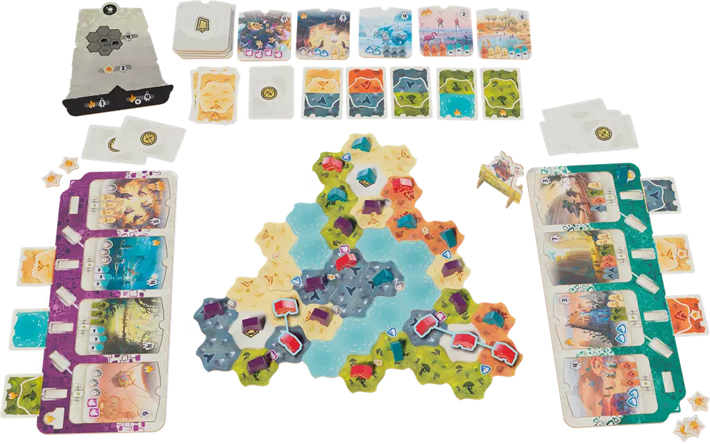 À chaque tour vous faites un choix simple : soit vous piochez deux cartes adjacentes dans la rivière de six cartes, soit vous placez un camp. Mais placer un camp, c'est plus subtil : vous dépensez des cartes correspondant aux terrains que vous traversez pour vous connecter à votre base ou à l'un de vos camps existants. Chaque zone d'eau compte comme un seul terrain franchi, ce qui crée des chemins intéressants. Passer sur un camp adverse ? Vous devez lui donner une carte correspondante. C'est du vrai échange sans combat.