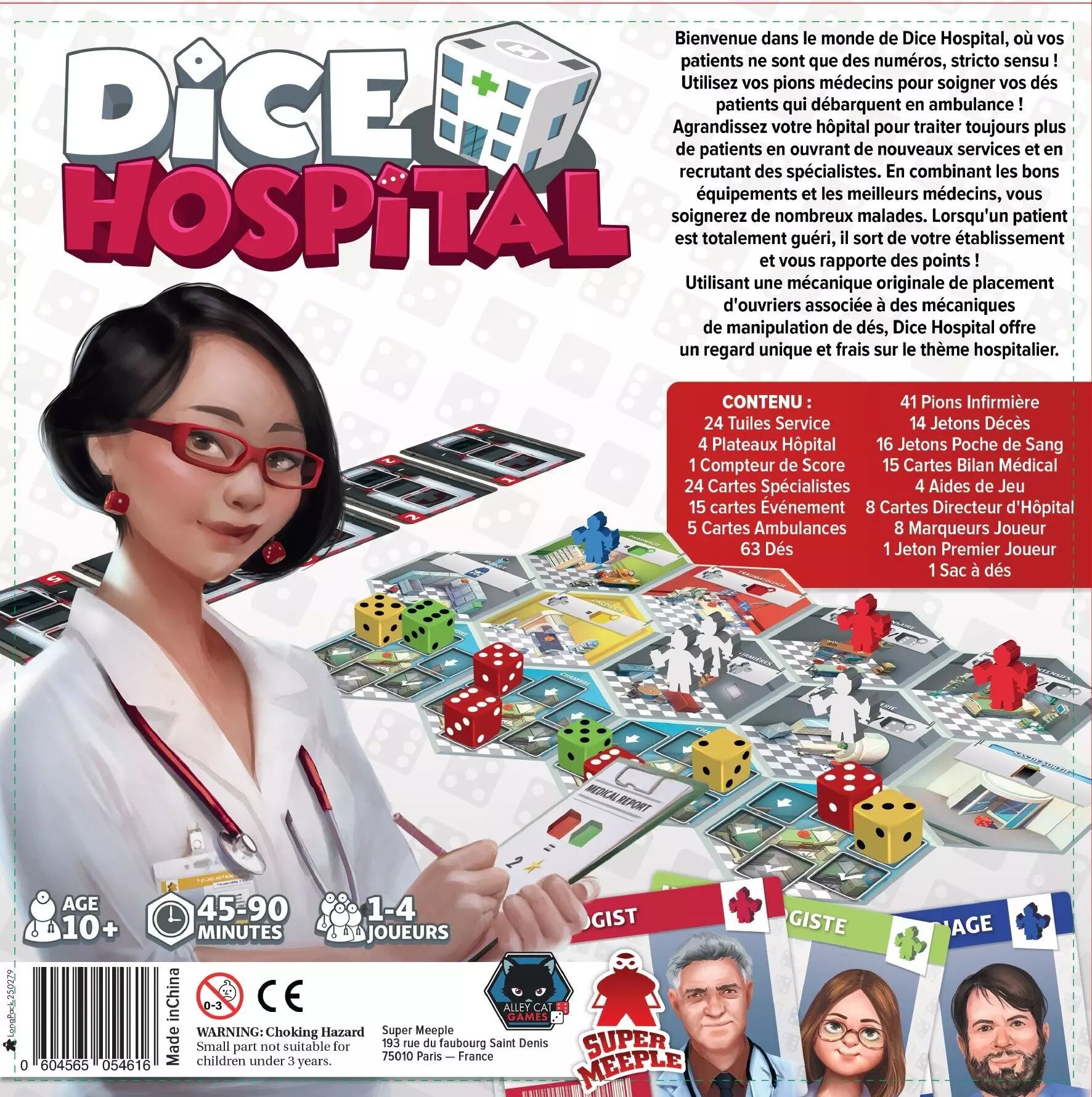 Dans Dice Hospital, les joueurs incarnent le responsable d'un hôpital. Durant 8 manches, les ambulances affluent remplies de personnes malades représentées par des dés. Leur valeur indique leur étant de santé, plus elle est faible, plus la personne a besoin de soins !