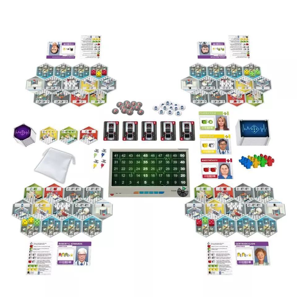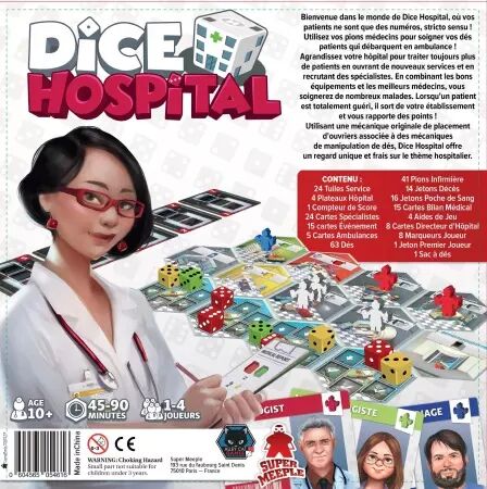 Réf. : JDPSMP018 Bienvenue dans votre Hôpital, où vos patients sont des dés ! Utilisez vos pions médecins pour soigner les patients qui débarquent en ambulance ! Agrandissez votre hôpital pour en traiter toujours plus en ouvrant de nouveaux services et en recrutant des spécialistes. En combinant les bons équipements et les meilleurs médecins, vous soignerez de nombreux malades. Lorsqu'un patient est guéri, il sort de votre établissement et vous rapporte des points.
