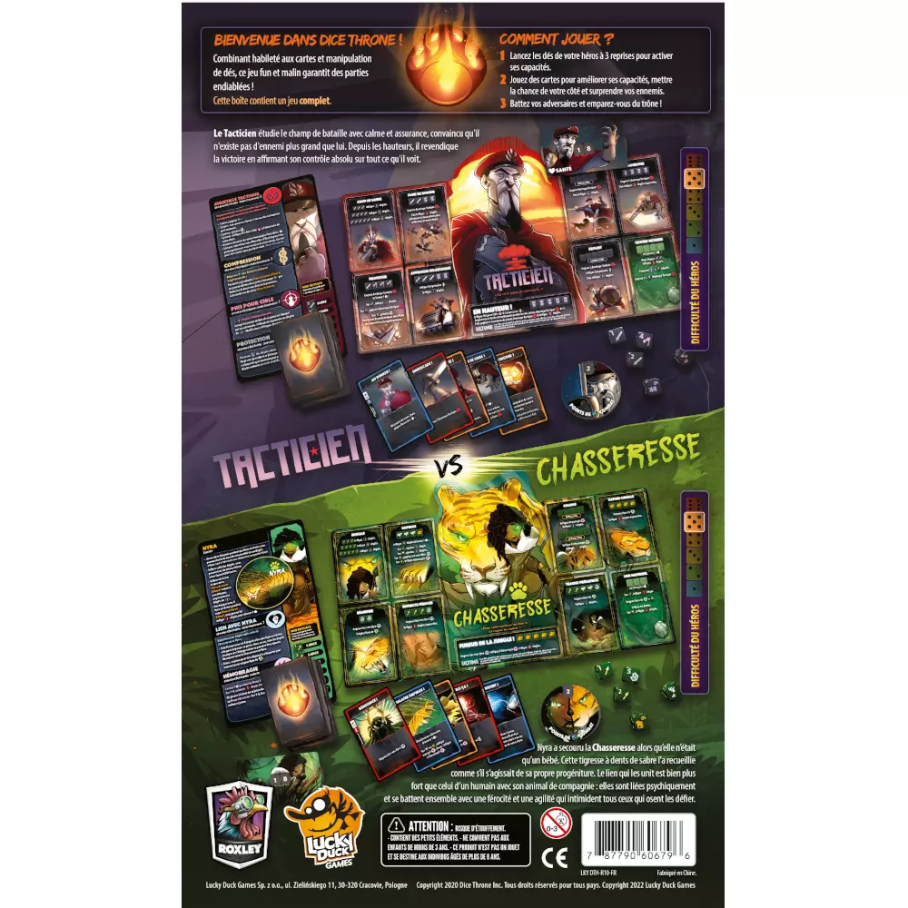 Choisissez le héros qui vous attire le plus, certains sont plus complexes à prendre en main, mais ils sont tous aussi forts les uns que les autres ! Lancez autant de dés que vous le souhaitez, jusqu’à 3 fois pour activer l’une de vos capacités. Utilisez les cartes d’améliorations pour booster vos capacités de héros tout au long de la partie ! Jouez vos cartes Action stratégiquement pour modifier vos dés et surprendre votre adversaire ! Battez vos adversaires en faisant tomber leur vie à 0 et prenez le trône !