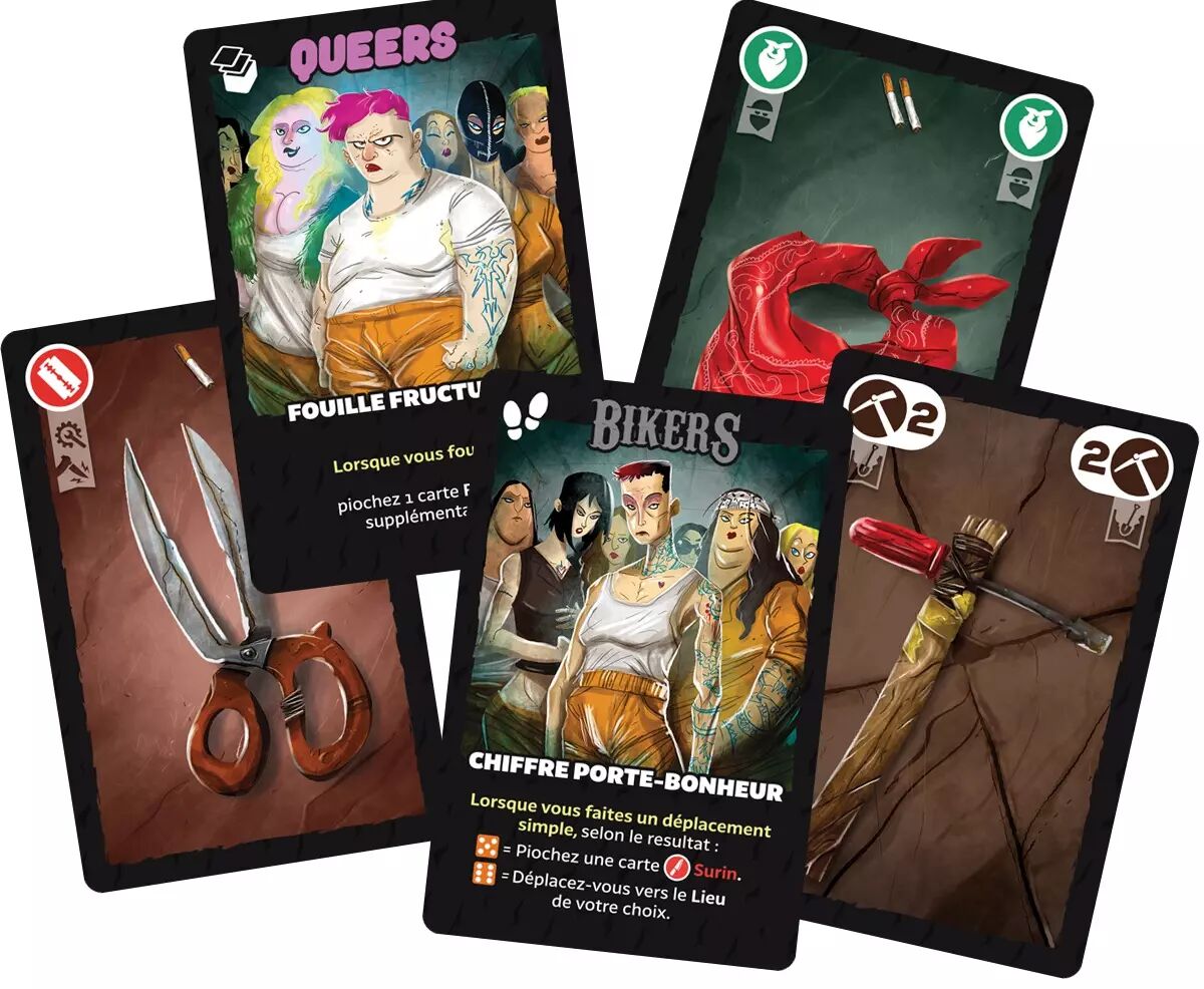 Comme les outils, les armes doivent être improvisées, fabriquées ou achetées avec des cigarettes. Bluff et mémoire sont né cessaires car il faudra faire attention aux cartes qui se trouvent dans la main de chaque joueur. Qui a des outils pour creu ser ? Qui a des lames pour se battre ? Pour vous aider, vous pouvez également re-joindre un gang, ou faire appel aux com-pétences et aux connexions de votre vie passée. En vous déplaçant dans la prison, vous pouvez effectuer diverses actions pour construire votre propre stratégie.
