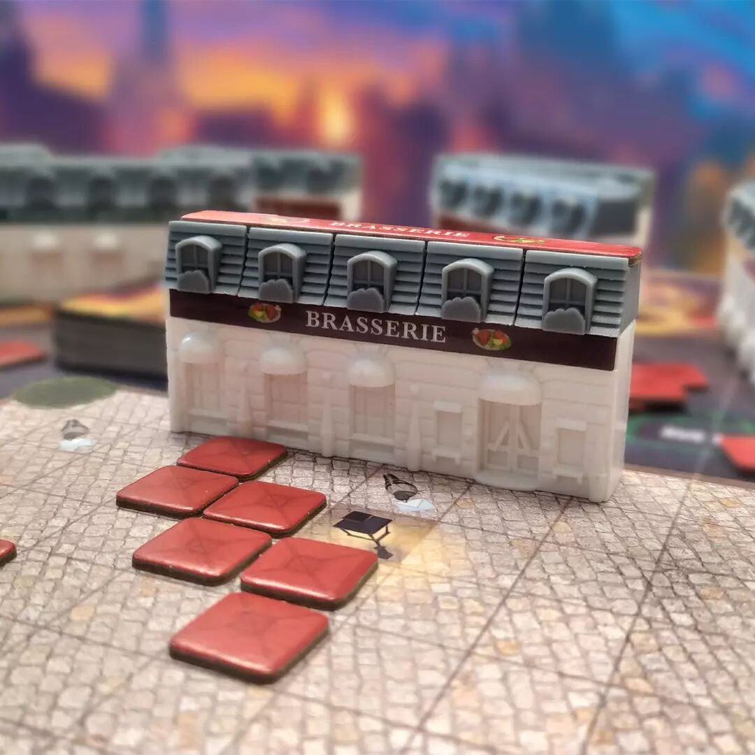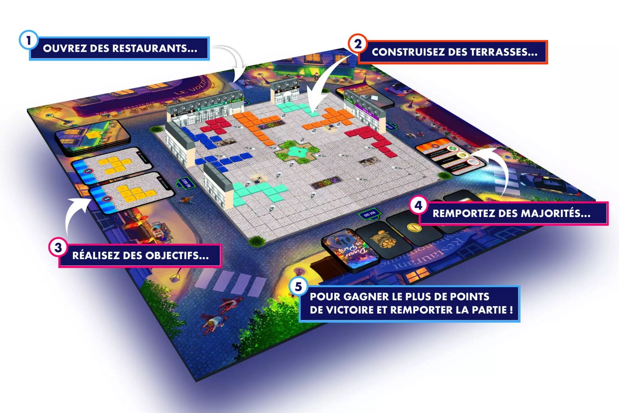 Contenu : - 1 plateau principal - 4 plateaux individuels - 48 cartes Ressource - 24 cartes Objectif - 24 cartes Pigeon - 8 cartes Majorité - 248 tuiles Terrasse - 72 tuiles Propriété - 18 restaurants - 60 unités de toit - 1 feuille d'autocollants - 1 carnet de scores - 8 cubes - 1 règle du jeu