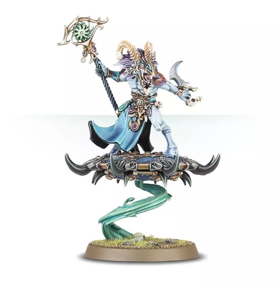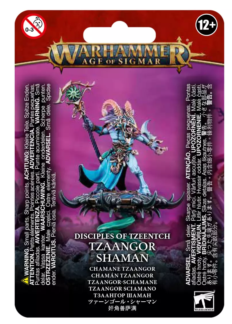 Doués d'aptitudes occultes, de visions précognitives et d'une intelligence sauvage, les Tzaangor Shamans sont les plus puissants en leur genre. Nés sous de sombres auspices, ils sont voués à la grandeur, et nantis de Disques de Tzeentch qui les élèvent au propre comme au figuré au-dessus de leurs congénères. Leur magie noire leur permet d'accorder un don douteux à leurs ennemis – la mutation sous une forme infiniment plus agréable à Tzeentch, celle d'un nouveau Tzaangor. Non contents de jeter des sorts en retrait, les Tzaangor Shamans sont redoutables en mêlée, et attaquent avec férocité.Ce kit plastique contient les composants nécessaires pour assembler un Tzaangor Shaman, porté par un Disc of Tzeentch hérissé de cornes et de crocs acérés, fixé au socle par une évocation sculptée de la magie qui le maintient en l'air. Il est bardé de pièces d'armure de Tzeentch ouvragées, et il est doté d'un élixir qui semble pouvoir magnifier ses impressionnantes capacités magiques rien qu'en l'avalant d'un trait.
