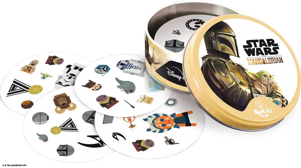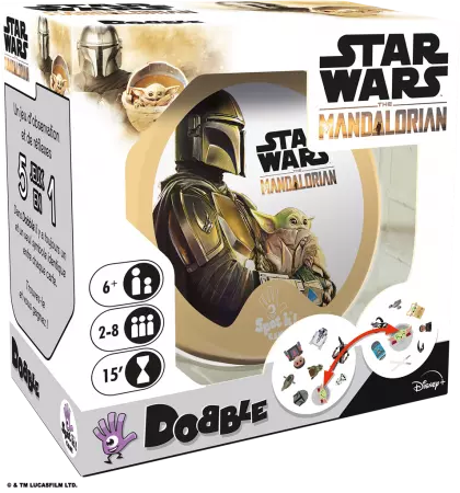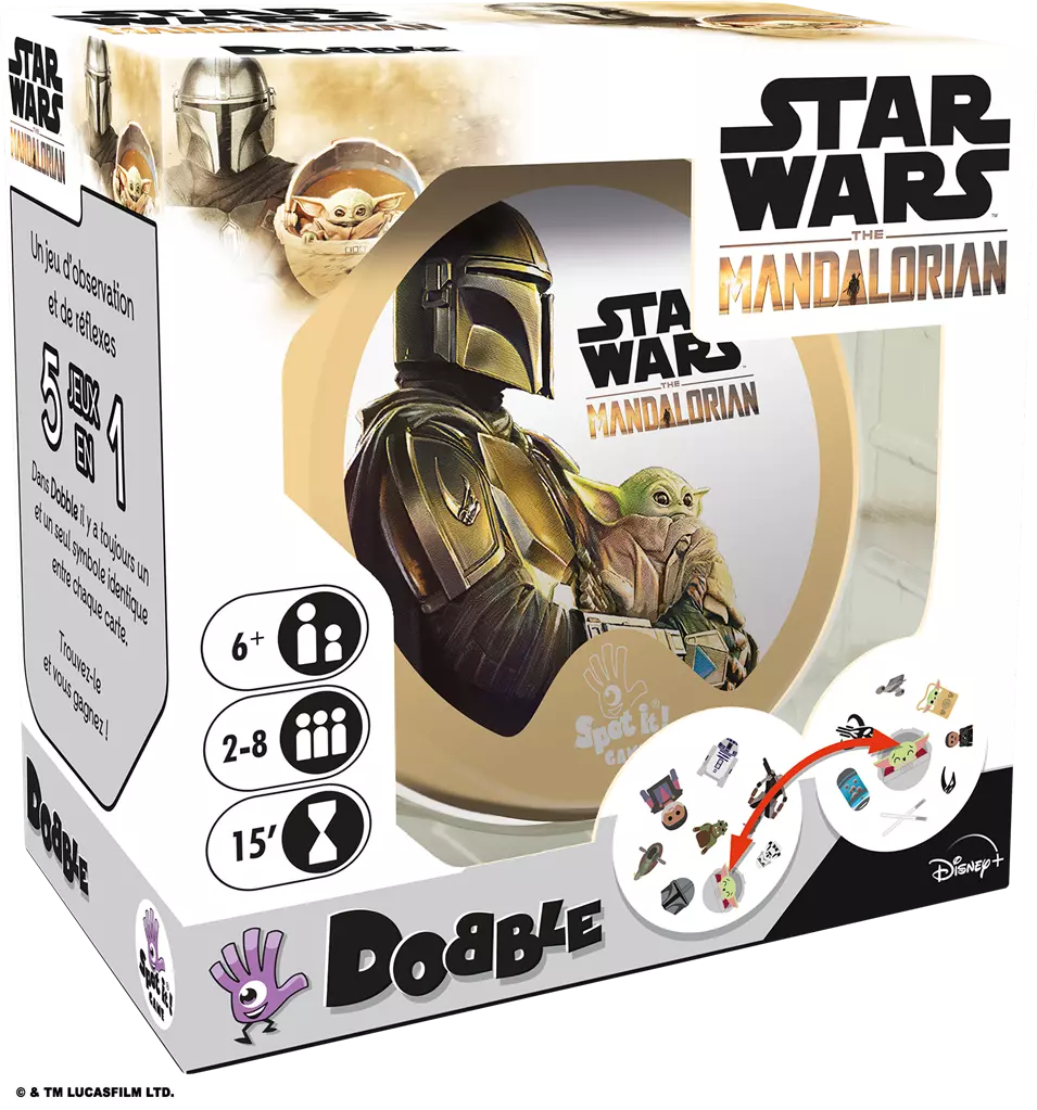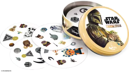 Ils font leur apparition sur les cartes de Dobble... Même Baby Yoda ! Un Dobble d'une galaxie très lointaine s'invite dans les familles et chez les fans de la série. Cette édition bénéficiera de son développement, ainsi que des films en préparation ! Repérez-les symboles en commun entre deux cartes et remportez la manche !