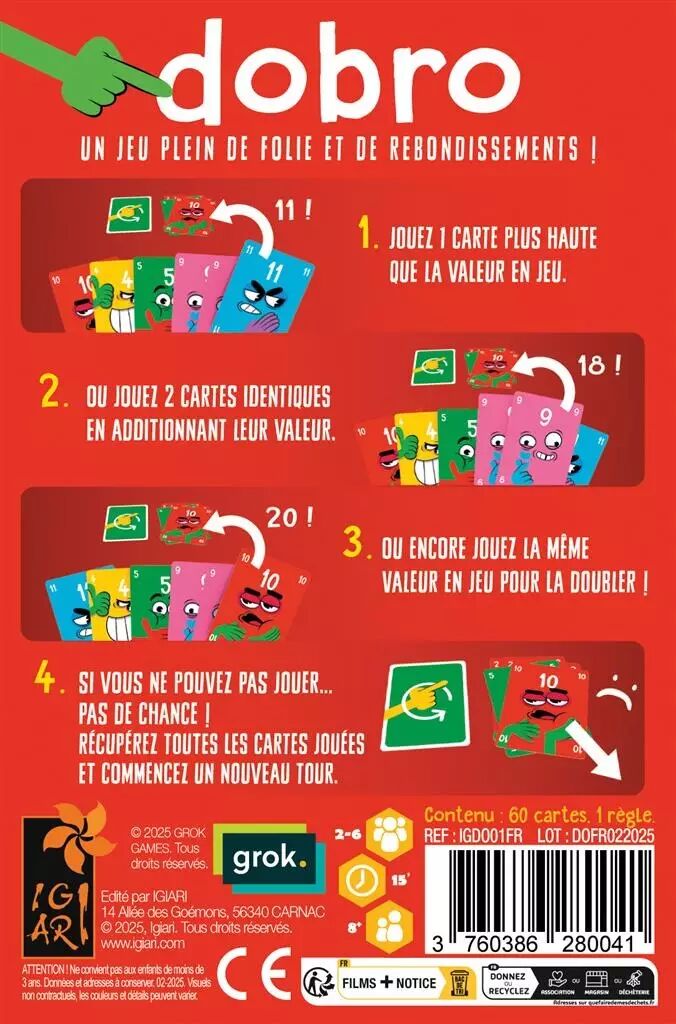 Dobro ne se contente pas d’être un simple jeu de défausse : il propose une carte d’oubli amusante qui pimente la partie et met l’ambiance autour de la table. Sa grande rejouabilité, ses illustrations pétillantes et son format transportable en font un incontournable pour tous ceux qui aiment les jeux conviviaux et accessibles. Prêt à relever le défi ?