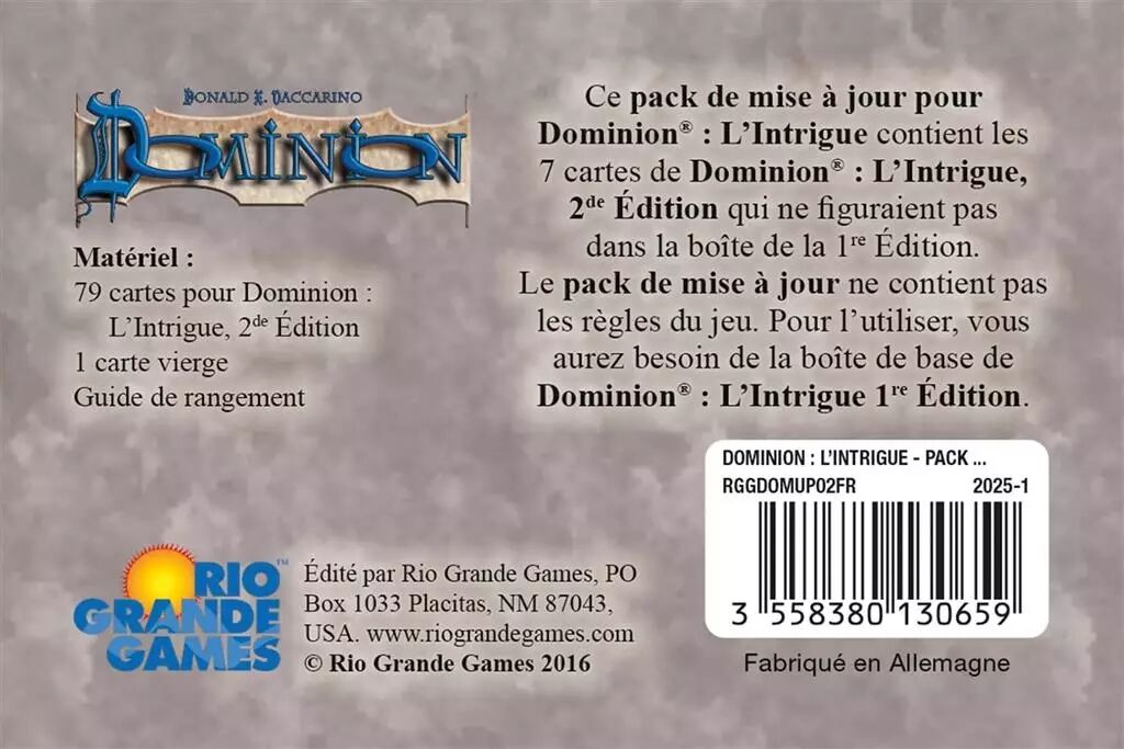 La seconde édition de Dominion® contient des cartes qui ne figuraient pas dans la 1ère édition. Ce pack a été conçu pour ceux qui veulent mettre à jour leur boîte, sans avoir à acquérir l’intégralité de la nouvelle édition. Il propose les 7 cartes inédites : Courtisan, Diplomate, Rôdeuse, Patrouille, Magouille, Passage secret, et Moulin. Chacune d’elles est en plusieurs exemplaires, prêtes à être intégrées à votre première édition.