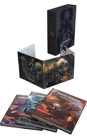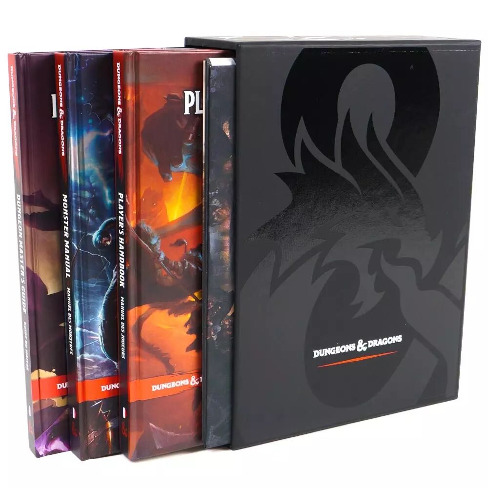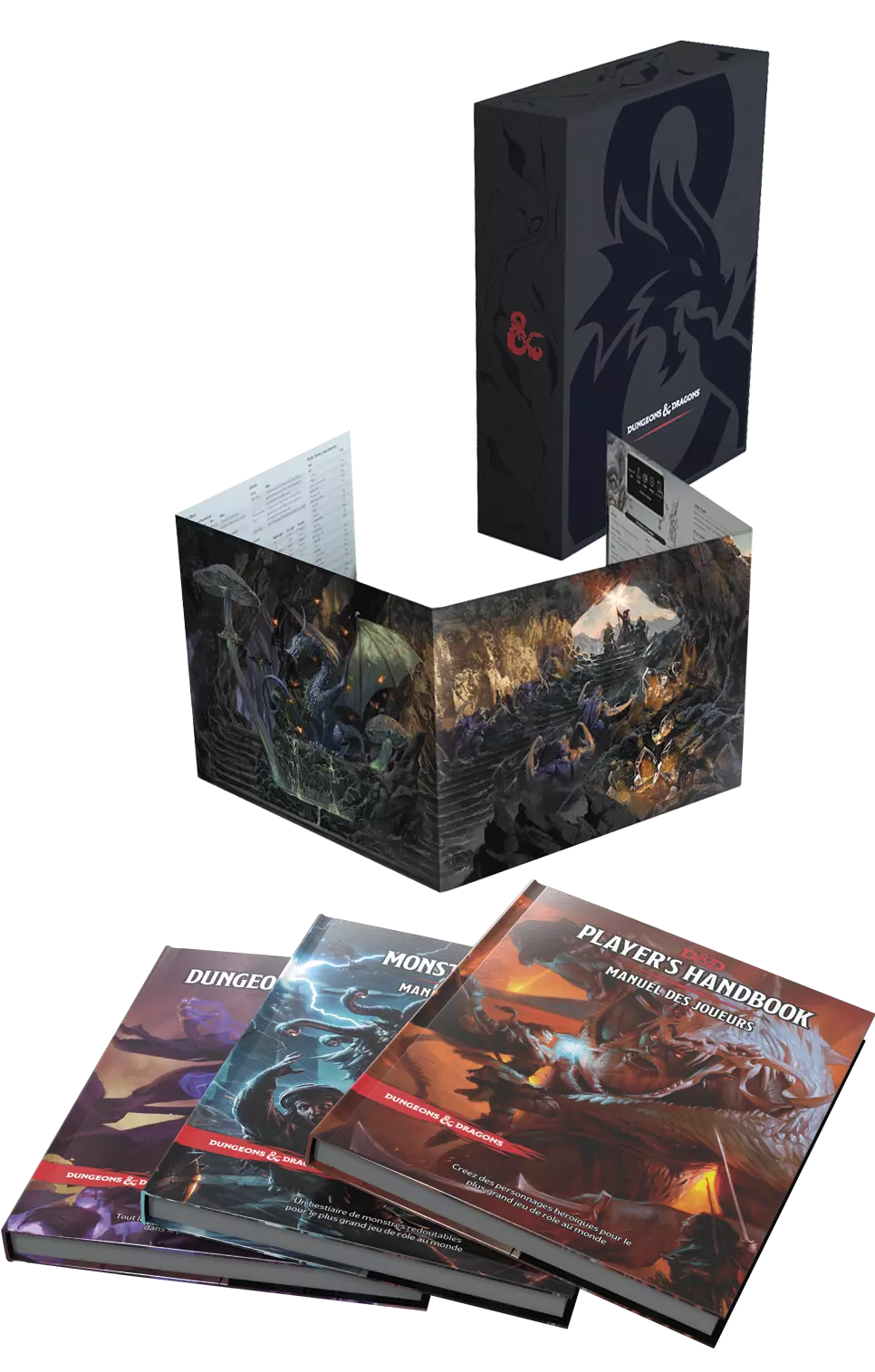 Ce coffret contient un exemplaire des trois livres de règles de base, ainsi qu'un écran de Maître du jeu, tous réunis au sein d'un élégant coffret. C'est le cadeau parfait pour tout fan de D&D.