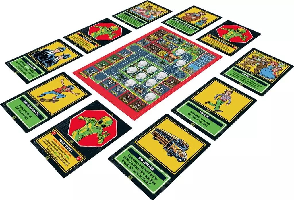 Au début de chaque partie, vous tirez trois cartes et placez vos gamins à l’école. Votre objectif est de les déplacer vers les lieux les plus rentables, comme la bibliothèque ou le parc, tout en évitant les envahisseurs. Chaque tour, vous jouez une carte pour avancer et en tirez une nouvelle. Mais attention, si une carte Alien est révélée, la menace se rapproche et il faut réagir rapidement pour sauver vos enfants. La partie se termine quand tous les Aliens sont placés, et celui qui a sécurisé le plus de gamins l’emporte.