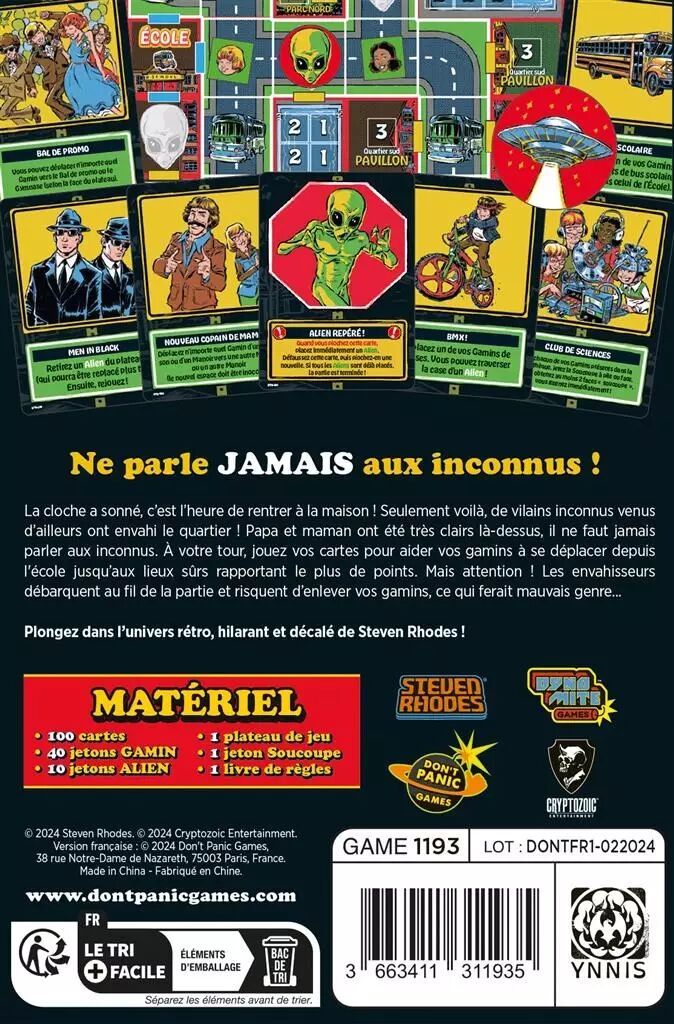 Plongez dans un monde coloré et nostalgique inspiré des années 1950, où les envahisseurs sont partout. Avec son design décalé et ses illustrations vibrantes signées Steven Rhodes, Don't Talk to Strangers offre une expérience visuelle unique et ludique qui rappelle les anciennes cartes à collectionner. Chaque partie est une véritable invitation à l’aventure dans cet univers rétro.