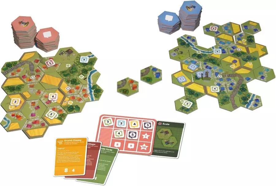Dorf Romantik : Le Duel reprend l’essence de la version coopérative mais introduit une compétition stimulante. Chaque joueur doit placer des tuiles dans son propre espace pour créer le meilleur paysage possible, tout en respectant des règles de placement précises qui renforcent l’aspect stratégique du jeu.