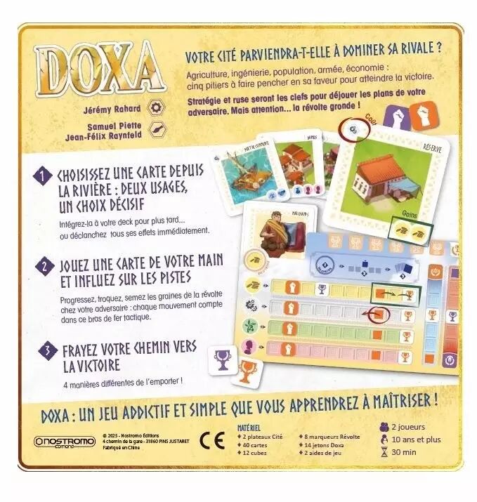 Doxa propose un affrontement nerveux et réfléchi où chaque joueur agit sur six piliers majeurs : population, richesse, ingénierie, nourriture, science et armée. Il faudra équilibrer développement et révolte pour éviter que ta cité ne sombre. Le choix des cartes, alliant constructions ou personnages emblématiques, impacte directement la progression de ta ville… mais aussi celle de ton rival.