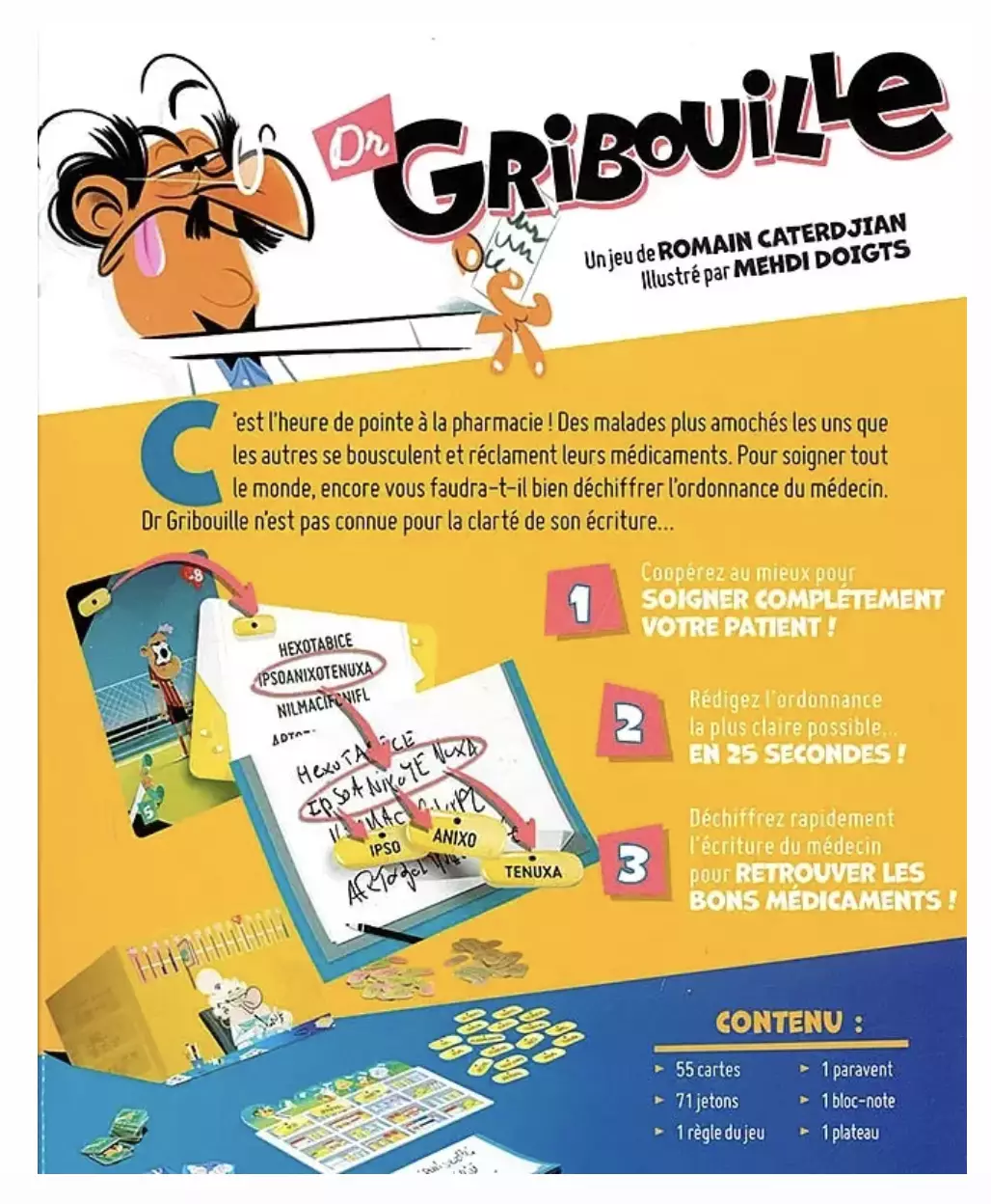 Dr Gribouille est un jeu où l’observation et la rapidité seront vos meilleures armes. Plongez dans l’univers décalé de la pharmacie du Dr Gribouille, où vous devez déchiffrer des ordonnances complètement illisibles sous pression ! Ce jeu de société coopératif est idéal pour créer des moments mémorables et hilarants entre amis ou en famille. Vous devrez faire preuve de concentration pour soigner les patients en un temps record et éviter les erreurs fatales. Un jeu où chaque seconde compte, car le temps presse pour sauver la patientèle !