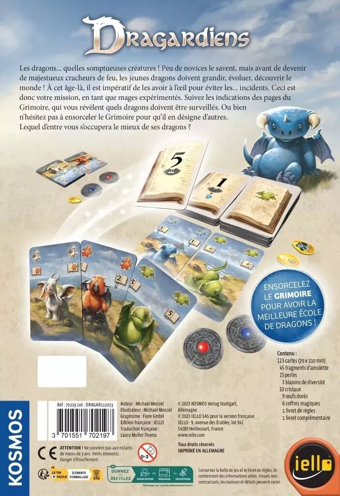 Dragardiens se distingue par ses règles originales et stratégiques. Le cœur du jeu repose sur un système de gestion de cartes, divisé en deux paquets principaux : un pour les récompenses et un autre pour les couleurs des dragons. Les joueurs piochent des cartes pour optimiser leur "école de dragons" pour marquer des points et obtenir des récompenses magiques. Le grimoire, un élément central du jeu, vous guidera dans vos choix et vous permettra de modifier les règles en cours de partie. Vous devrez également gérer vos ressources, collecter des fragments d'amulettes et d'autres objets magiques, et faire preuve de ruse pour optimiser votre stratégie.