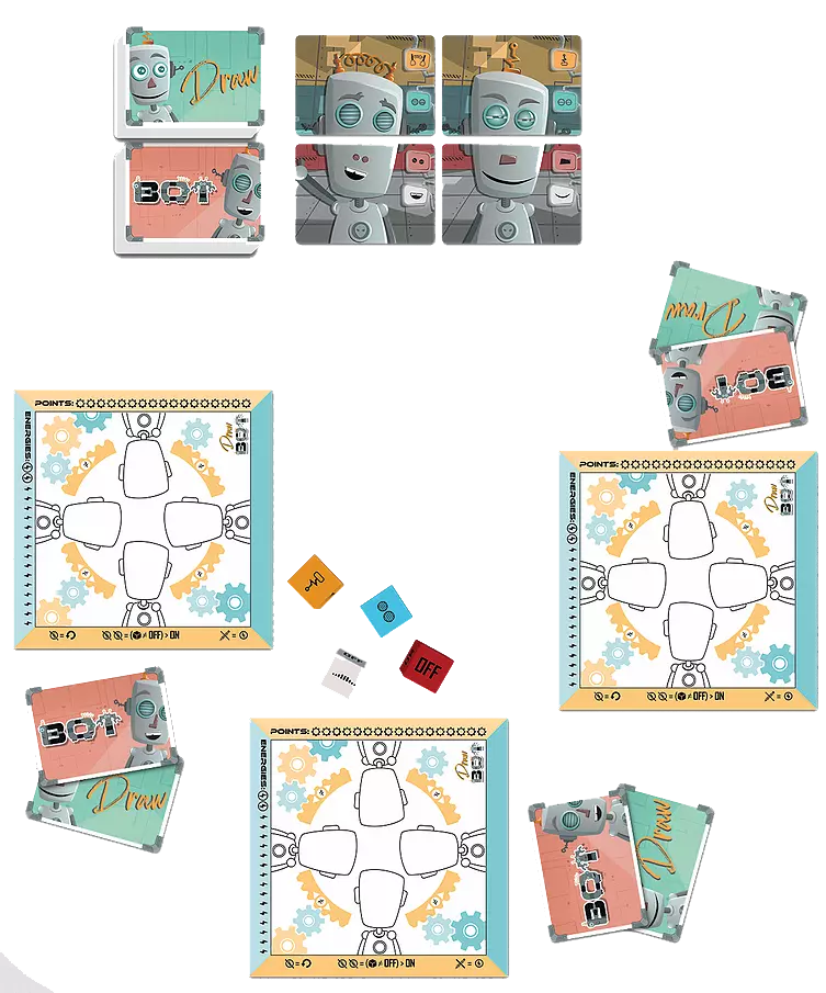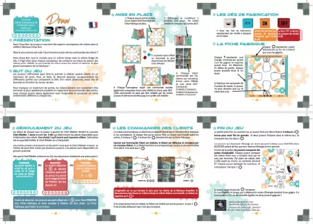 Tout le monde joue en même temps avec le même tirage de dés. Il s'agit donc pour chaque concepteur de trouver comment combiner au mieux les pièces des robots pour réaliser la commande du client avant les autres et devenir l'employé du mois de la fabrique !