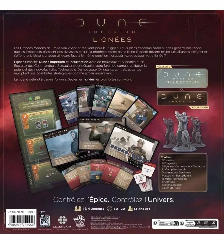 Lignées apporte une nouvelle dimension au jeu de base en introduisant la notion de dynasties sur plusieurs générations. Il faut gérer avec finesse ses alliances, déployer ses Sardaukar sur le champ de bataille, et utiliser habilement les nouvelles technologies pour prendre l’avantage. Chaque décision résonne dans l’univers complexe de Dune.
