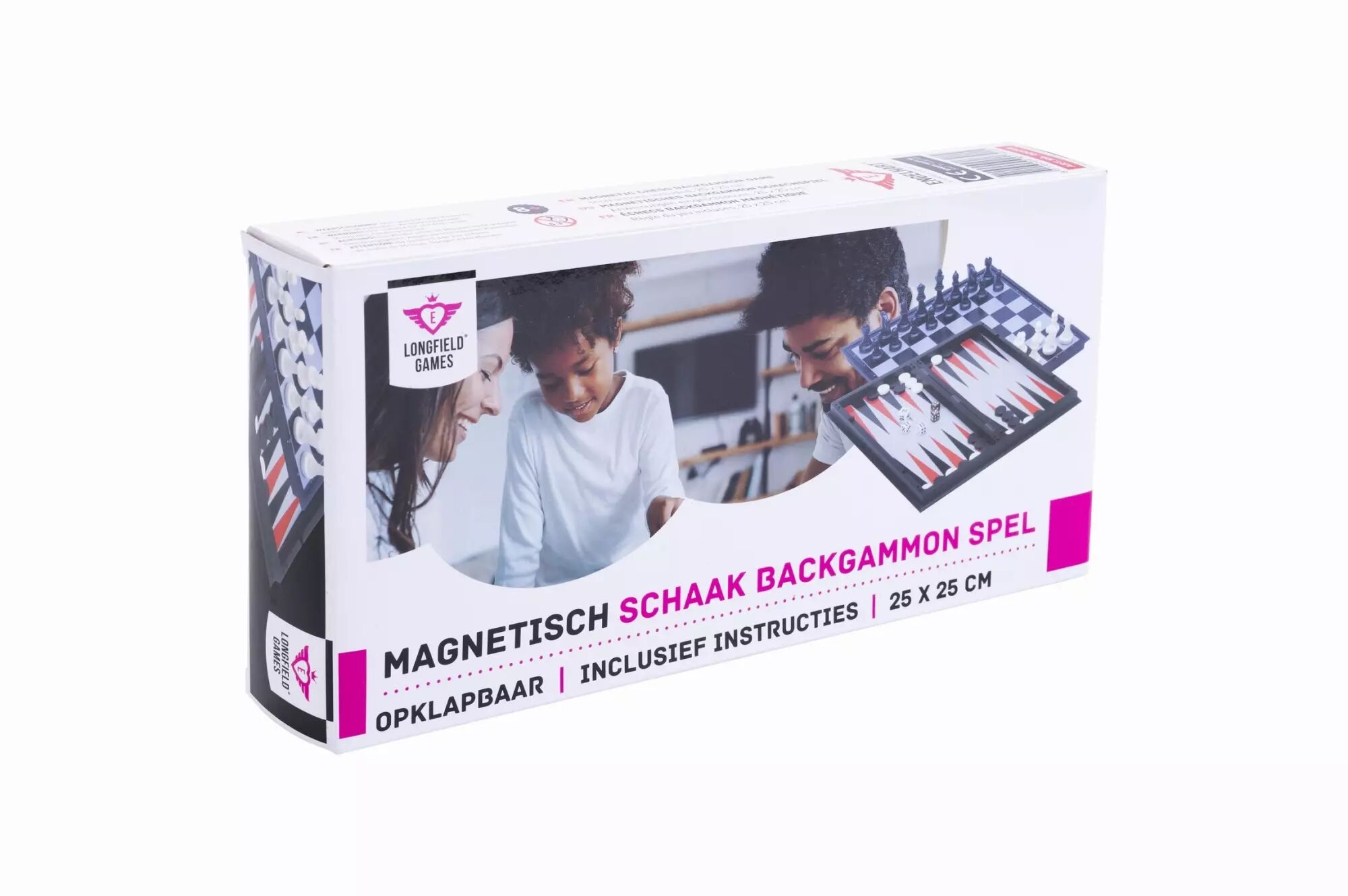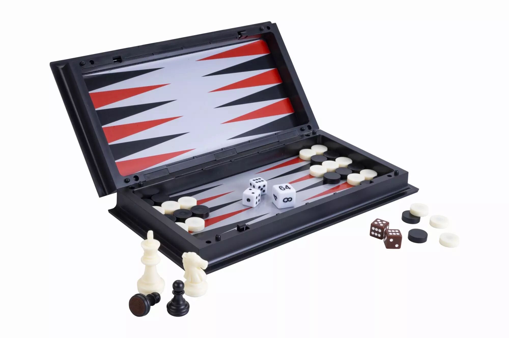 Se referme comme un coffret, contenant : 1 backgammon et 1 jeu d'échecs, pièces des jeux et règles du jeu incluses.