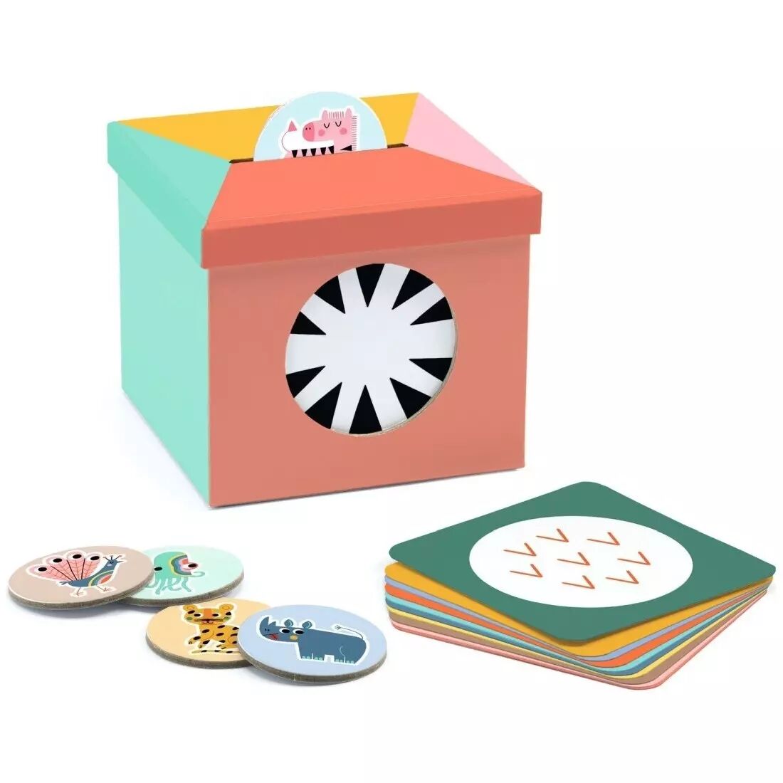 Un jeu d'observation et de tri composé de pièces en carton épais faciles à attraper et à insérer dans une astucieuse boite-tirelire. En jouant, l'enfant apprend à regrouper les animaux selon un critère physique.