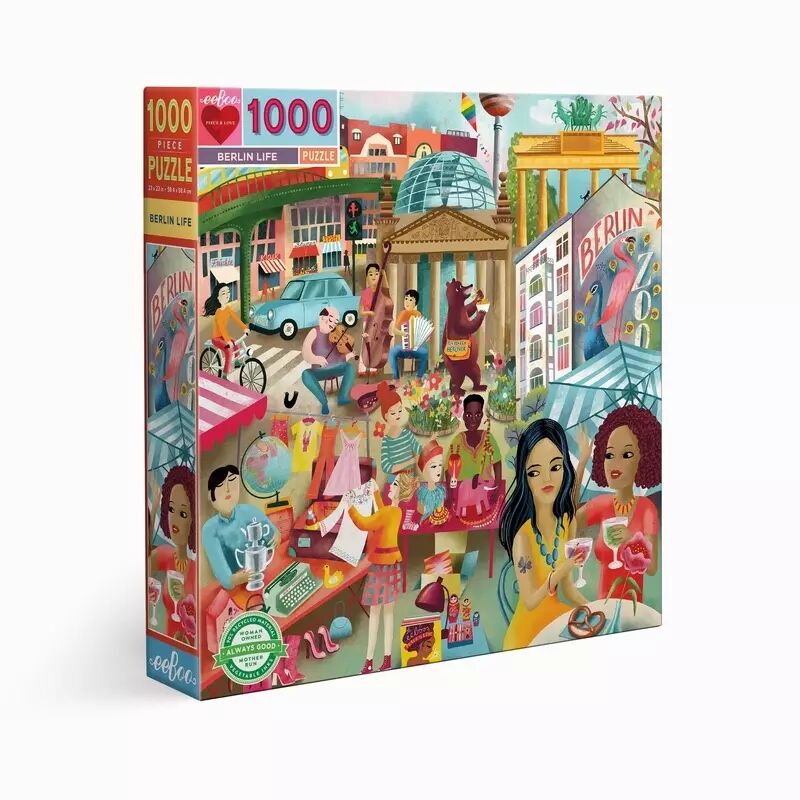 Berlin, la capitale de lAllemagne, est connue pour son style et sa culture de la jeunesse, son architecture et son histoire politique chargée, qui sont tous, et plus encore, vivement illustrés par lartiste allemande Uta Krogmann. La diversité ethnique de la ville, ses marchés aux puces, ses monuments de renommée mondiale et le simple plaisir de lamitié tout en prenant un verre et en partageant un bretzel sont au cur de ce puzzle. Et noublions pas lours de Berlin qui déguste des frites ! Köstliche !