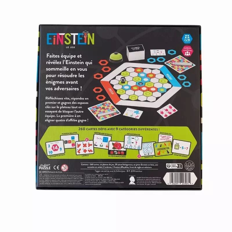 Einstein mélange habilement apprentissage et plaisir. En cultivant mémoire, réflexion et logique, ce jeu enrichit les compétences de tous, tout en créant des moments de complicité uniques. En famille ou entre amis, chaque partie devient l’occasion de se dépasser… et de rire à en pleurer !