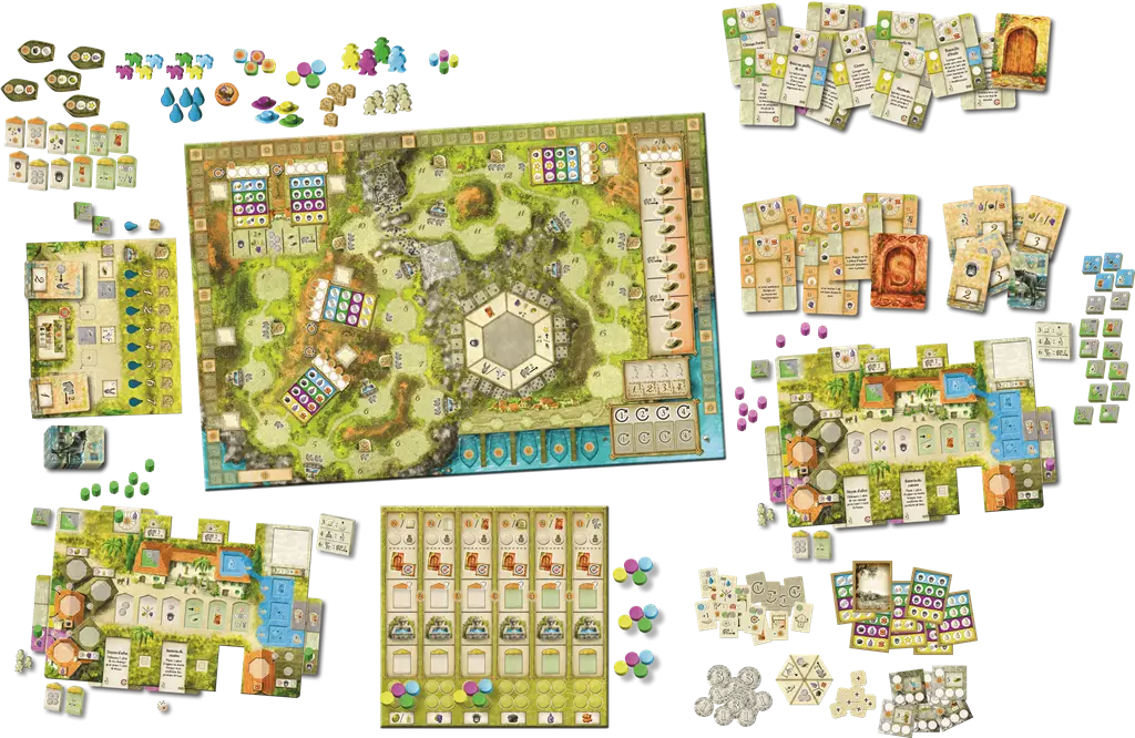 Contenu de la boîte : Plateau principal, plateaux individuels double couche, cartes multi-usages, pions ânes, dés, tuiles bonus, meeples saisonniers, règles et aide de jeu