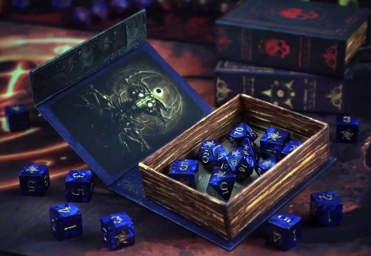 Chaque ensemble de Elder Dice comprend la gamme complète des neuf dés de jeu polyédriques : 1 dé à quatre faces, 3 dés à six faces, 1 dé à huit faces, 1 dé à dix faces, 1 dé à dix faces pourcentile, 1 dé à douze faces et 1 dé à vingt faces. Le tout est soigneusement emballé dans une boîte de style livre de sorts assortie, dotée d’une fermeture magnétique. Ses dimensions intérieures sont de 2,75 pouces sur 3,75 pouces.