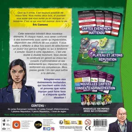 Cette extension introduit deux nouveaux éléments. A chaque match, vous serez confronté à des évènements aussi variés qu'imprévisibles, dépendant des attributs de vos joueurs. Il vous faudra y réfléchir à deux fois avant de sélectionner un joueur aux genoux fragiles ou qui a tendance à simuler. Quant à votre réputation… C'est une réalité à double tranchant. Vous devrez la construire en gérant au mieux les conseils d'administration et ces évènements qui, impactant le club, renforcent vos compétences. Mais prenez garde ! Un rien peut suffire à la détruire…