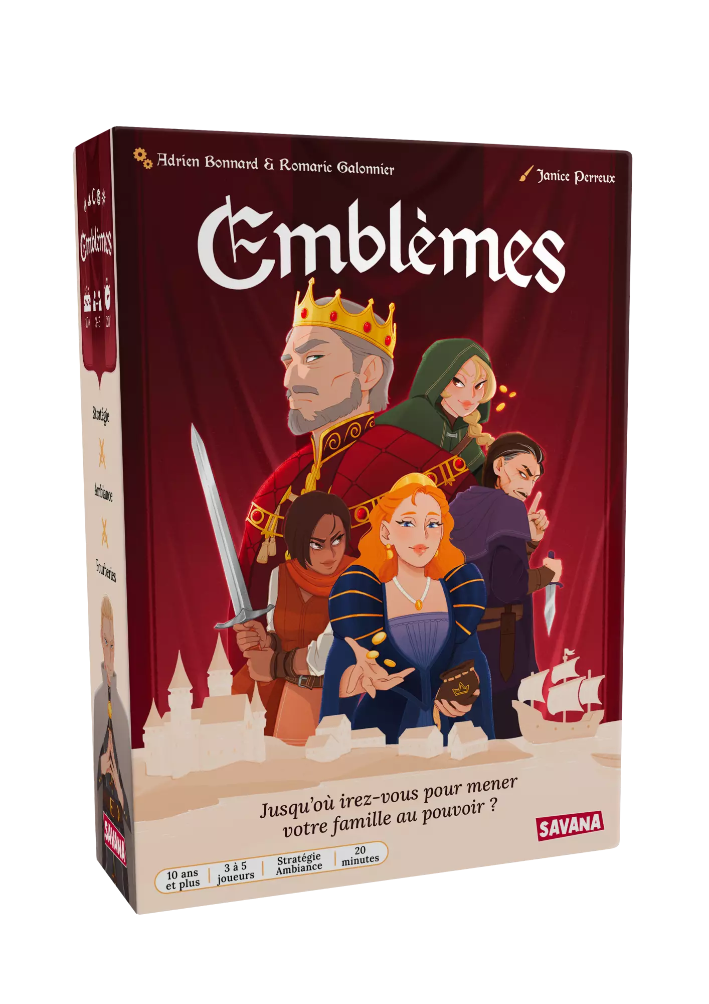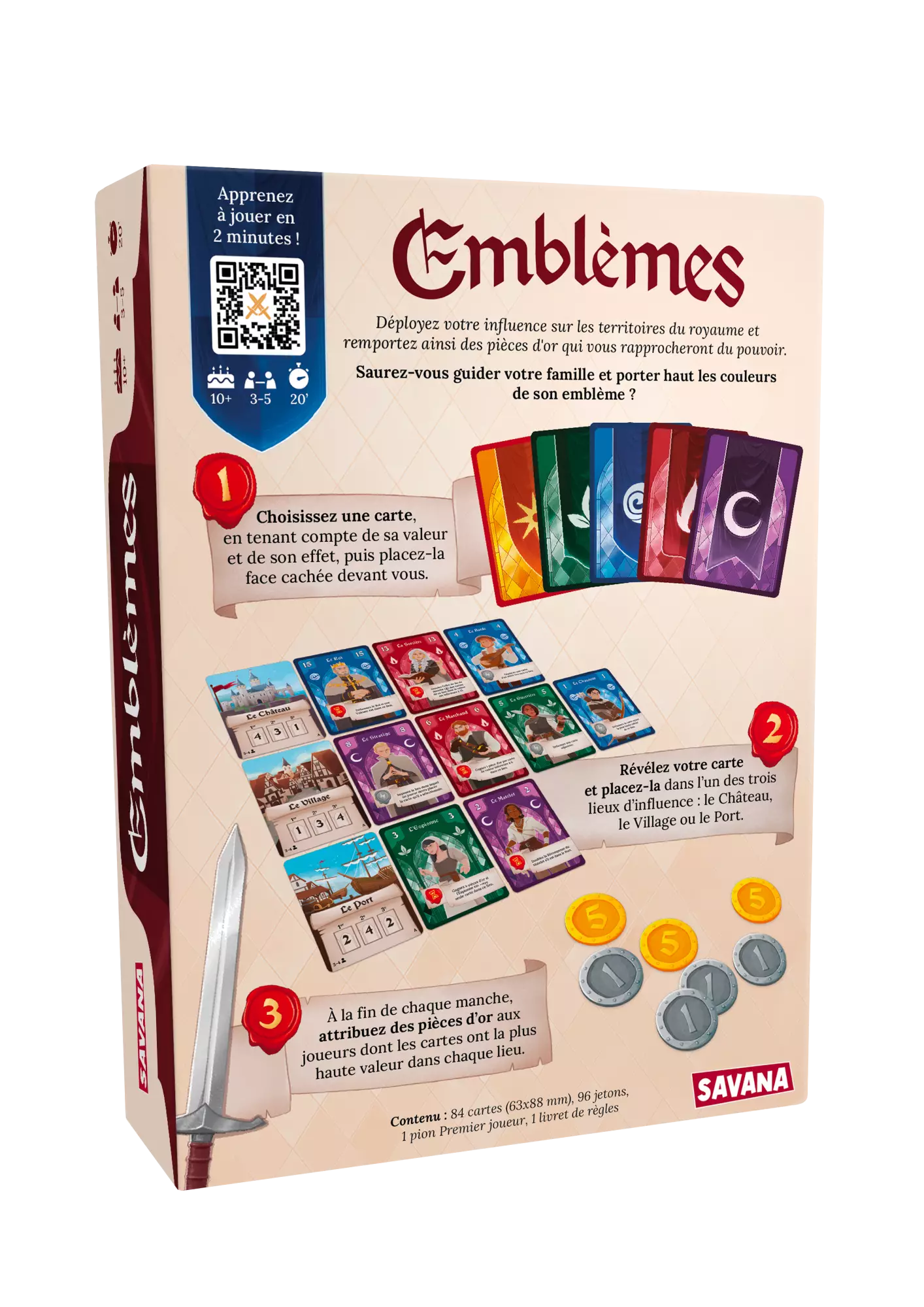 Au début de chaque tour, choisissez une carte, en tenant compte de sa valeur et de son effet, puis placez-la, face cachée, devant vous. Puis, l'un après l'autre, révélez votre carte et placez-la dans l’un des trois lieux d’influence : le Château, le Village ou le Port. À la fin de chaque manche, attribuez des pièces d’or aux joueurs dont les cartes ont la plus haute valeur dans chaque lieu. À la fois simple, surprenant et un brin chaotique, EMBLÈMES récompense souvent les joueurs les plus malins (ou les plus audacieux) !