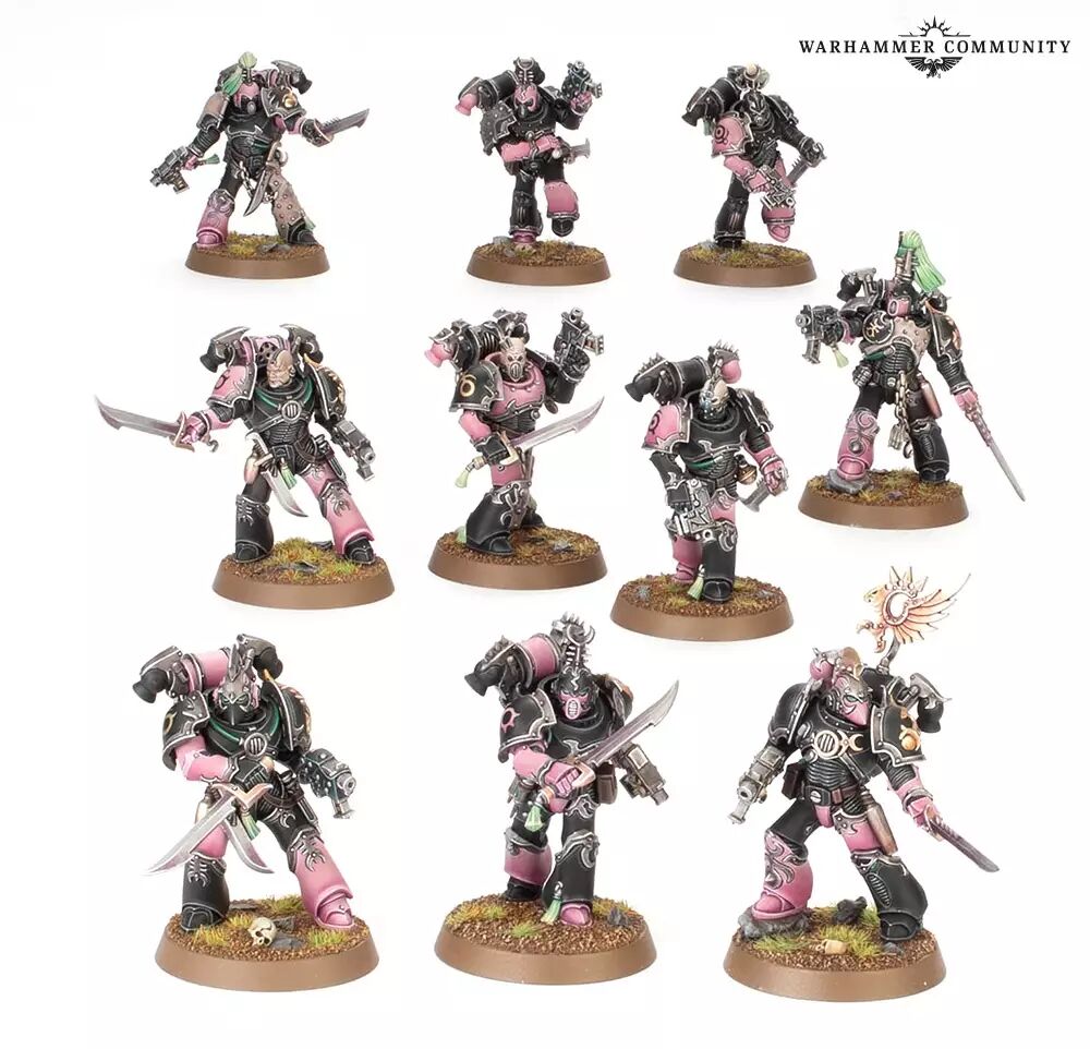 Il est rejoint par deux unités de six Marines du Bruit - qui peuvent inclure chacune un Disharmoniste - tandis que les Marines du Bruit ordinaires disposent d'un large choix de têtes, d'épaules et de museaux pour leurs blasters soniques. Les Tourmenteurs manient leurs armes à distance avec précision tandis que les Infracteurs sont obsédés par le combat rapproché. La boîte contient 20 Space Marines qui peuvent être construits comme l'un ou l'autre avec un choix d'accessoires pour la personnalisation.
