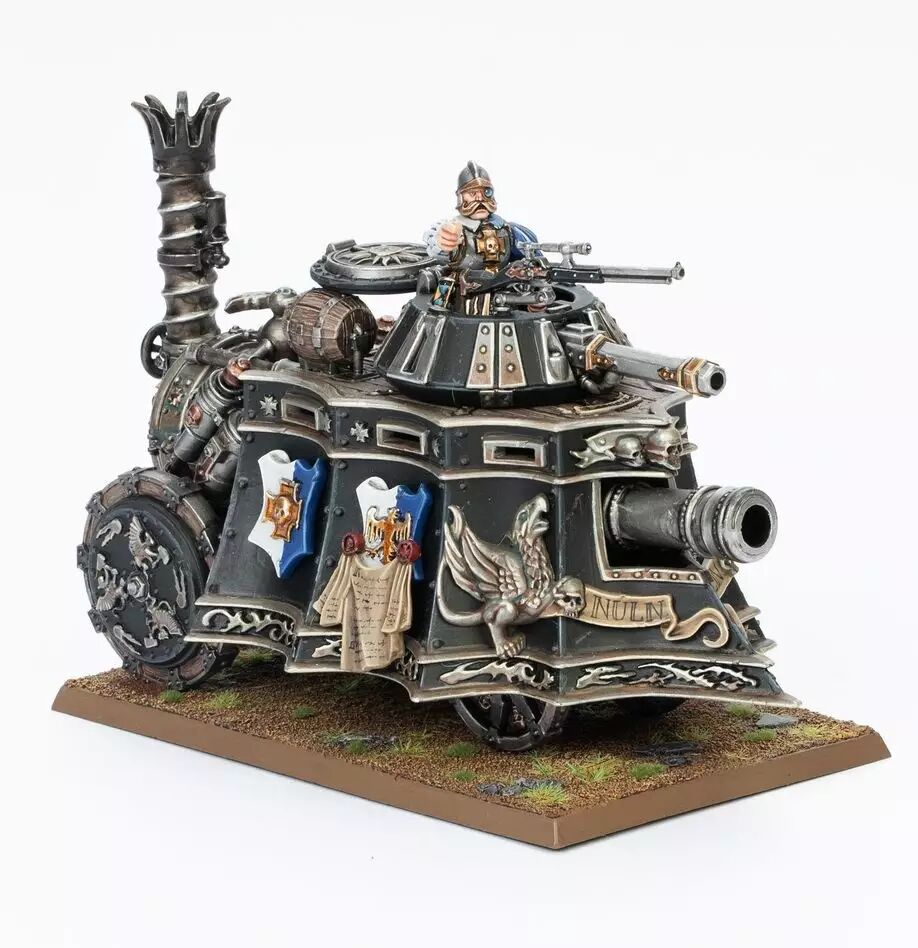 Les Tanks à Vapeur de l'Empire sont de monstrueuses machines de guerre vomissant de la fumée, alimentées par des chaudières sous pression qui envoient de la vapeur dans des tuyaux et des pistons. L'avancée de ces colosses de fer est terrifiante, car les flèches rebondissent sur leurs coques blindées, et les guerriers ennemis finissent écrasés sous leur masse imposante.