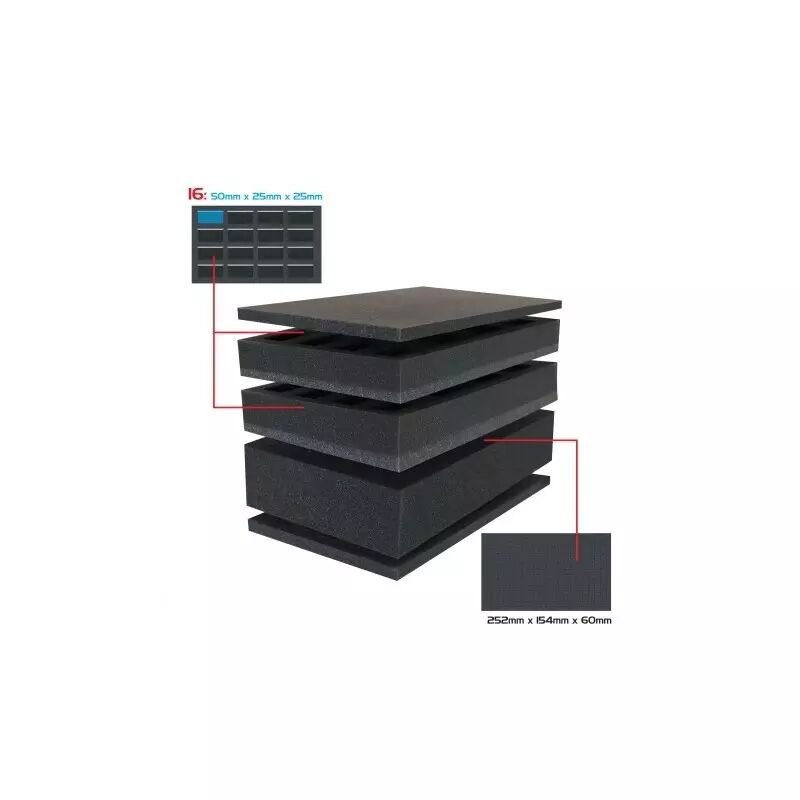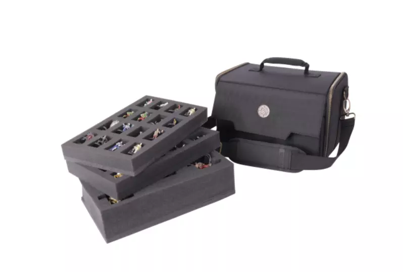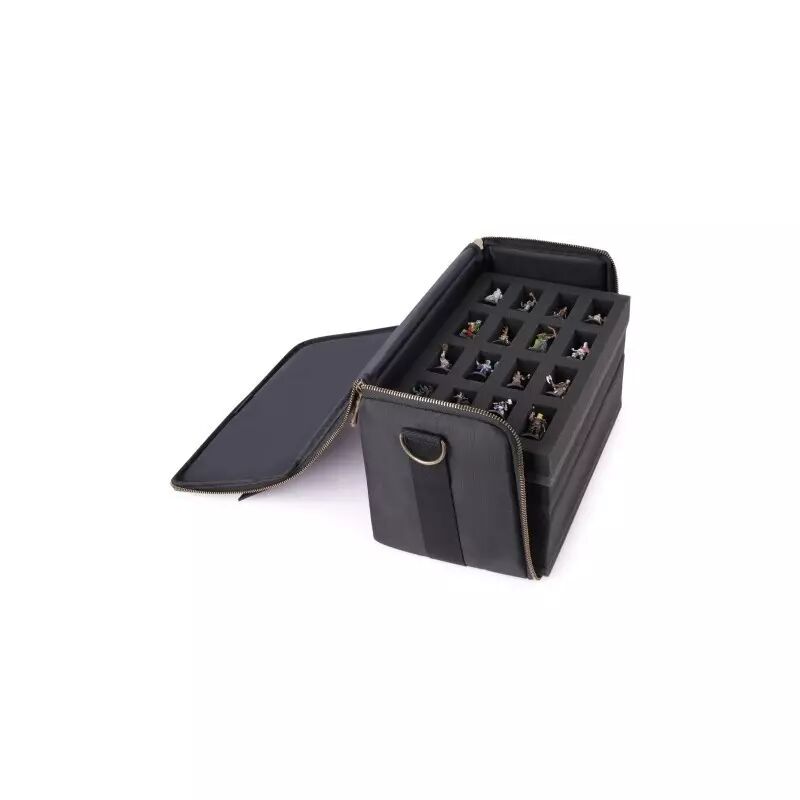 Il comporte 3 plateaux en mousse pour ranger et protéger vos figurines en toute sécurité : deux plateaux à 16 emplacements pour les figurines de taille standard (20 à 25 mm), et un plateau personnalisable de 60 mm d'épaisseur pour les figurines plus grandes ou irrégulières.