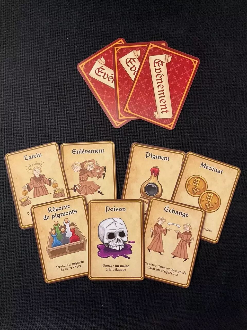 Utilisez vos moines pour produire les pigments nécessaires à l’illumination des histoires. Dépensez votre or chez vos voisins pour acquérir les pigments manquants et utilisez avec stratégie vos cartes évènement qui vous permettront de renverser le cours de la partie.