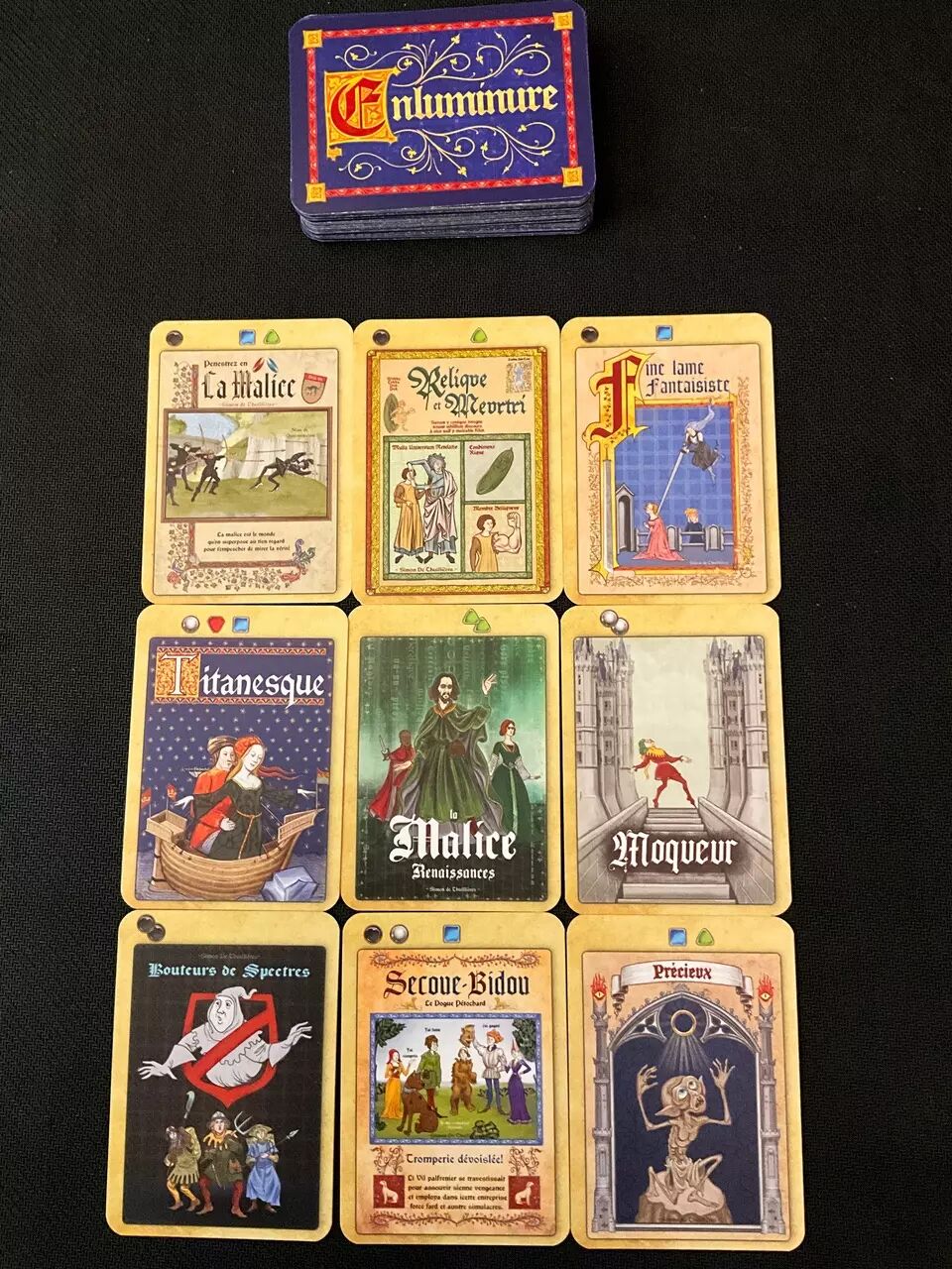 Les Enlumineurs est un jeu pour 2 à 5 joueurs âgés de 7 à 777 ans. Chaque partie dure environ 30 minutes. Le jeu est constitué de 130 cartes et de jetons, rassemblés dans une boîte rigide. Il est fabriqué en Royaume François.