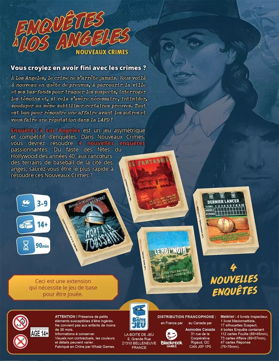 Complément du Jeu Enquêtes à Los Angeles, vous aurez besoin de la boite de base pour jouer. Cette boite vous propose 4 nouveaux scénarios à découvrir, toujours dans l'univers film noir de Los Angeles des années 40. Du faste des fêtes de Hollywood, aux rancœurs des terrains de Baseball, explorez la ville jusqu'à ses tréfonds ! Le jeu reste le même : un jeu d'enquête asymétrique et compétitif. Les Inspecteurs (ou équipes d'inspecteurs) vont tout faire pour être premier à résoudre l'enquête. Que ce soit soudoyer des indics, subtiliser des preuves, ou même mettre la pression aux témoins, rien ne vous arrête. Le Marionnettiste de son côté, va aiguiller les joueurs dans leur expérience. Incarnant les suspects interrogés, il pourra tenter de mener les inspecteurs en bateau, ou au contraire, venir en aide aux joueurs en retard, grâce au système CRM : les Cartes à Réponses Modulaires.