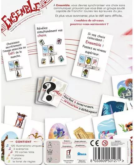 Ensemble vous invite à vivre une expérience de jeu unique où la coopération et la communication non verbale sont les clés du succès. Dans ce jeu coopératif, vous allez devoir travailler main dans la main avec vos coéquipiers pour associer des cartes Souvenir avec des cartes Défi. Mais attention, vous ne pouvez pas communiquer entre vous ! Vous devez donc utiliser votre intuition et votre sens de l'observation pour choisir la carte qui correspond le mieux à chaque défi.