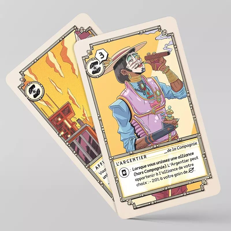 Le jeu renferme 42 cartes personnage et 11 cartes affinité. Chacune de ces cartes est au format tarot et contient une illustration unique.