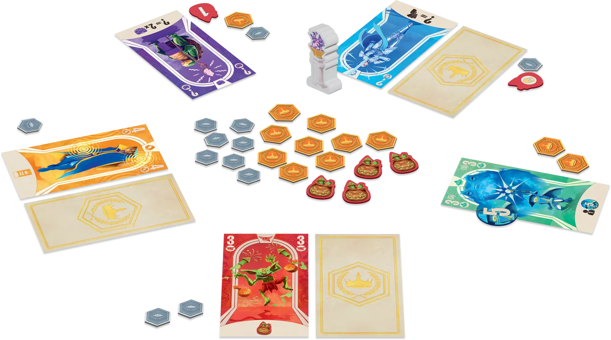 Contenu : 54 cartes, 6 aides de jeu recto verso, 18 jetons Butin Or, 18 jetons Butin Argent, 1 jeton Invocation de Grenouille Géante.
