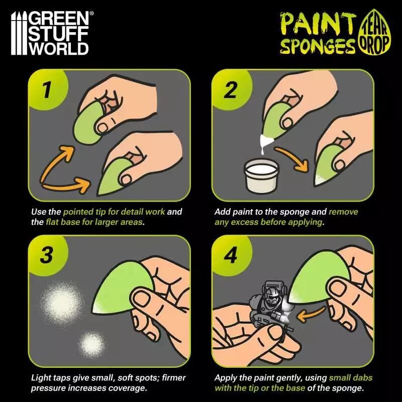 Ce pack d'éponges en forme de goutte est conçu pour offrir un contrôle exceptionnel dans une grande variété de techniques de peinture dans le domaine du modélisme, des miniatures et des arts créatifs. Grâce à leur profil stylisé et à leur capacité à s'adapter à différentes surfaces, elles sont particulièrement utiles pour appliquer sans effort des couches de base, des nuances douces ou des textures légères. Leur géométrie en forme de larme permet de travailler sur de grandes surfaces et des détails plus fins avec le même outil, ce qui en fait une ressource très polyvalente pour les débutants comme pour les peintres expérimentés.
