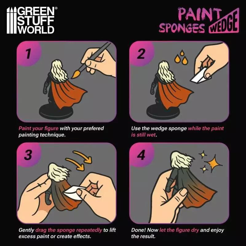 Ces éponges triangulaires sont particulièrement efficaces dans les situations où la précision est essentielle, comme pour affiner les lignes de panneaux, adoucir les accumulations de pigments ou nettoyer les excès de peinture lors de l'aérographie. Leur géométrie angulaire vous permet de travailler avec la pointe pour les détails fins, les bords pour un estompage ou un dégradé contrôlé, et les côtés plats pour des coups de nettoyage plus larges. La mousse à texture fine assure une application et un retrait lisses et sans traces, ce qui la rend idéale non seulement pour le nettoyage, mais aussi pour des tâches créatives telles que la production de motifs d'usure, de transitions tonales douces ou d'effets de vieillissement subtils sans laisser de marques ou de rayures.